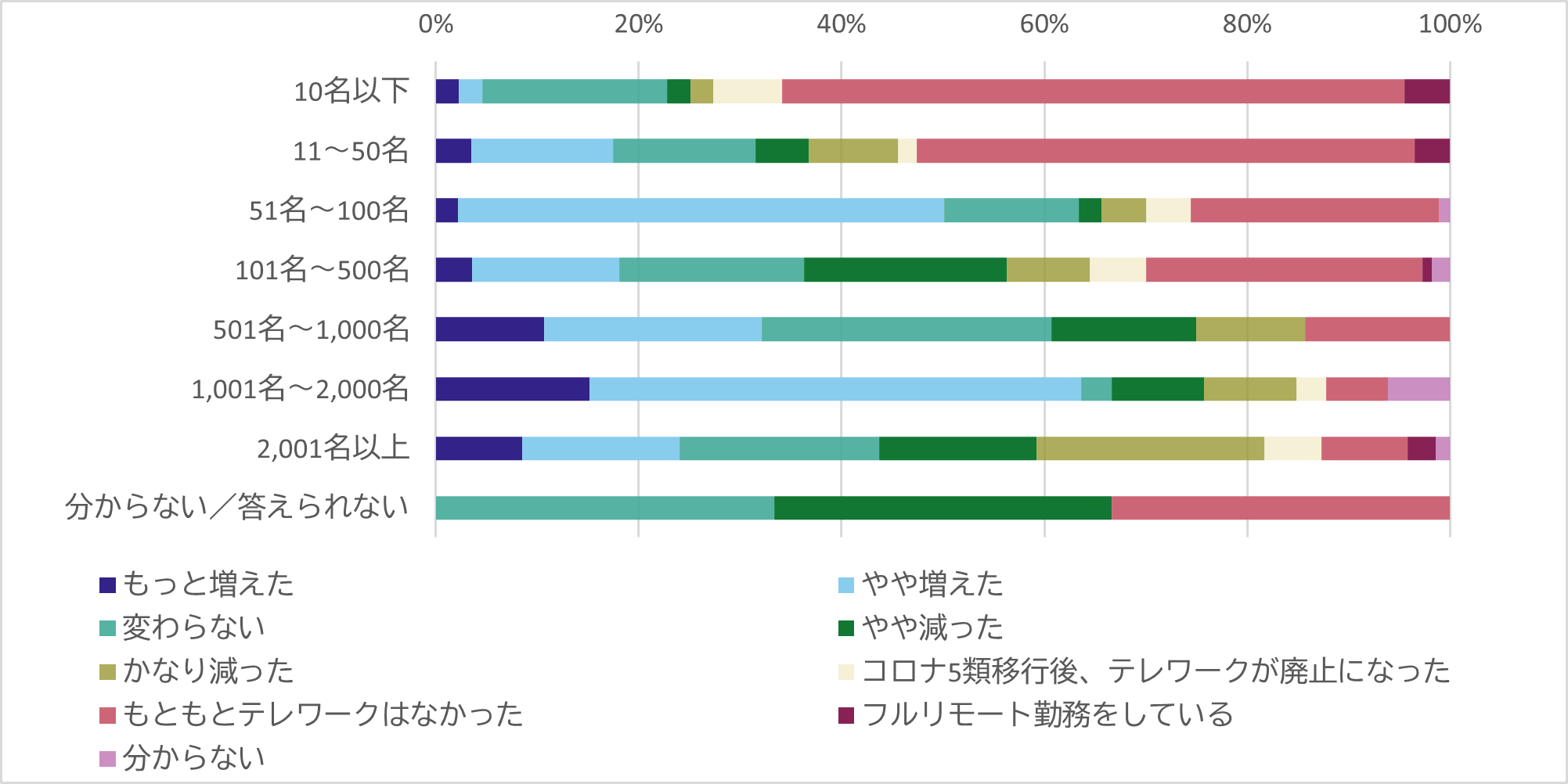 回答者の所属する企業の従業員規模で比較すると、2,000名以下の企業に所属する回答者にテレワークの比率が「増えた」層が多く見られ、2,001名以上の企業では「減った」層の方が多い結果となりました。