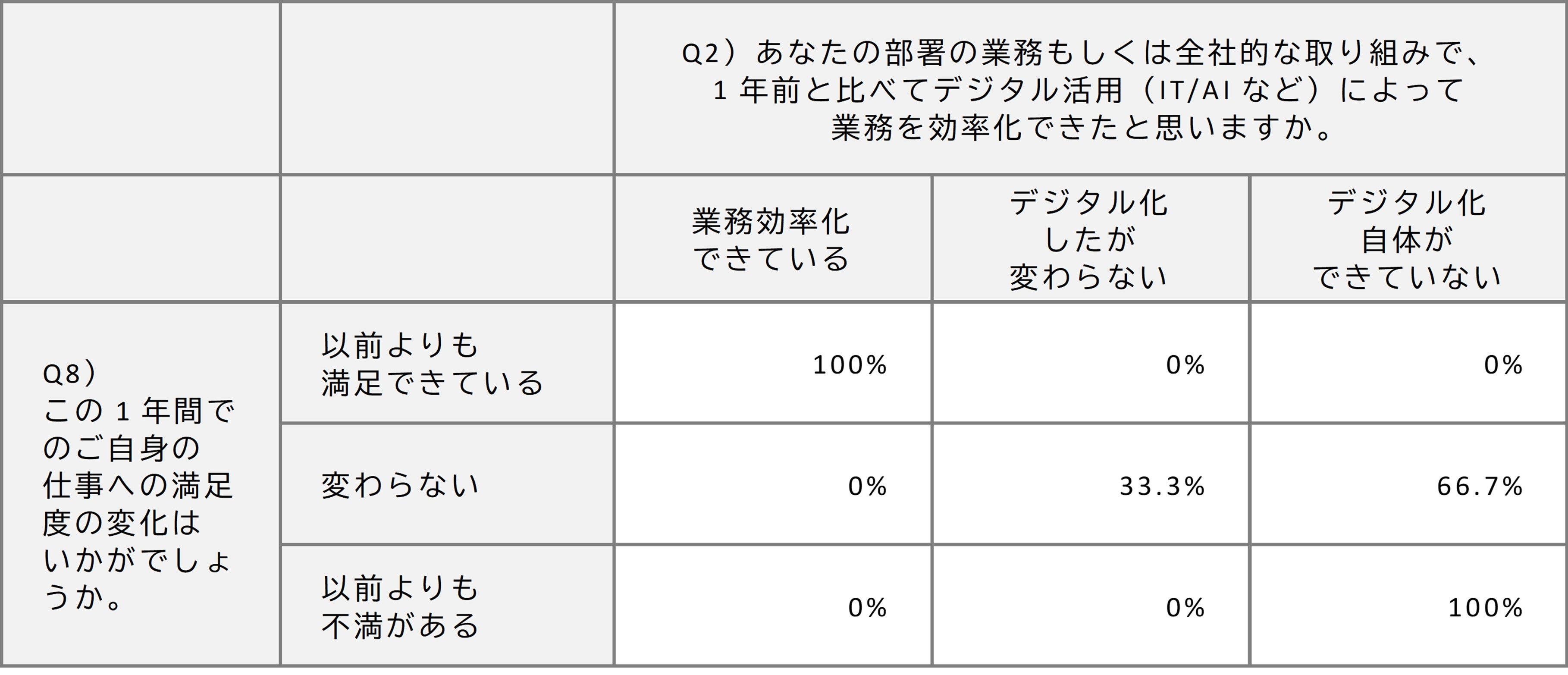 前項で「テレワークが増えた」人の仕事への満足度が上がっているのに対し、「フルリモート勤務をしている」人の仕事への満足度にはバラツキがありました。そこで「フルリモート勤務をしている」人を分析した結果、「以前よりも満足できている」人はいずれも「業務効率化できている」ことを実感していました。一方、「(満足度は)変わらない」「以前よりもかなり不満がある」人は、いずれも「デジタル活用自体ができていない」もしくは「デジタル化したが(業務効率は)変わらない」と感じていることが分かりました。