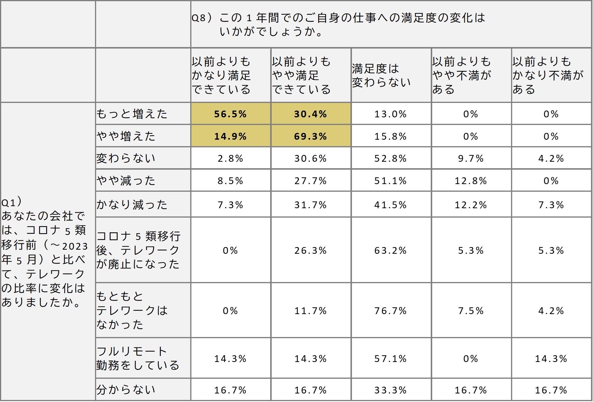 ・コロナ5類移行後にテレワークが増えた層の約8割は仕事への満足度も向上している