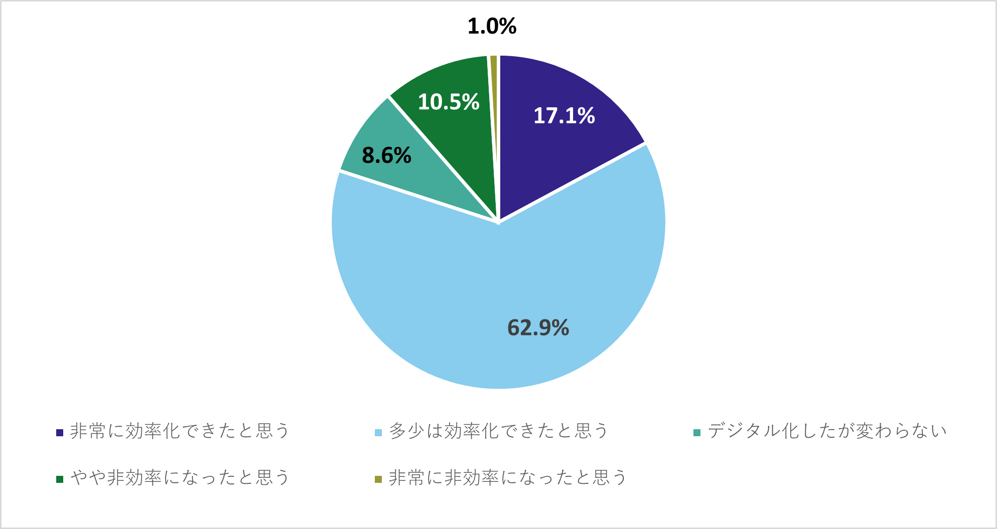 「テレワークが増え、かつ満足している」回答者(105名)の「デジタル活用による業務効率化の傾向」を見ると、「効率化できている」とする回答が80%を占め、全体の傾向(52.8%)を大きく上回る結果となりました。