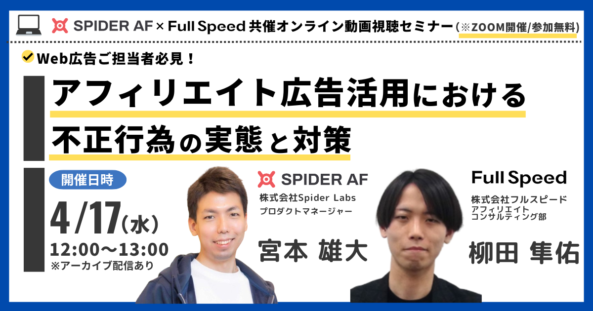 このような状況を踏まえ、株式会社FullSpeedは最先端の不正チェックツール「Spider AF」との協業を通じて、アフィリエイト広告の安全、そして企業様のブランディングの双方を守るための新たなソリューションをご紹介するセミナーを開催いたします。
