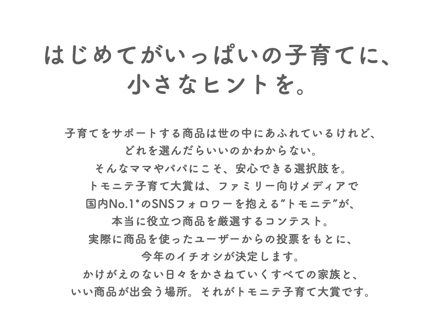 「トモニテ子育て大賞」は、“初めての育児に戸惑うママやパパへ新しい商品との出会いの機会を創出したい”という思いから開催しており、本当に役立つ商品を厳選し、子育てに関わるすべての方々の育児ライフを豊かなものにしていきたいと考えています。