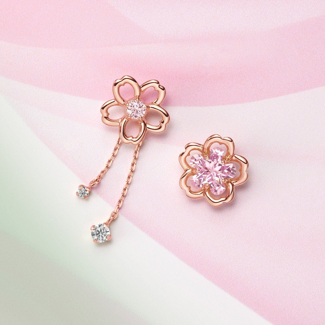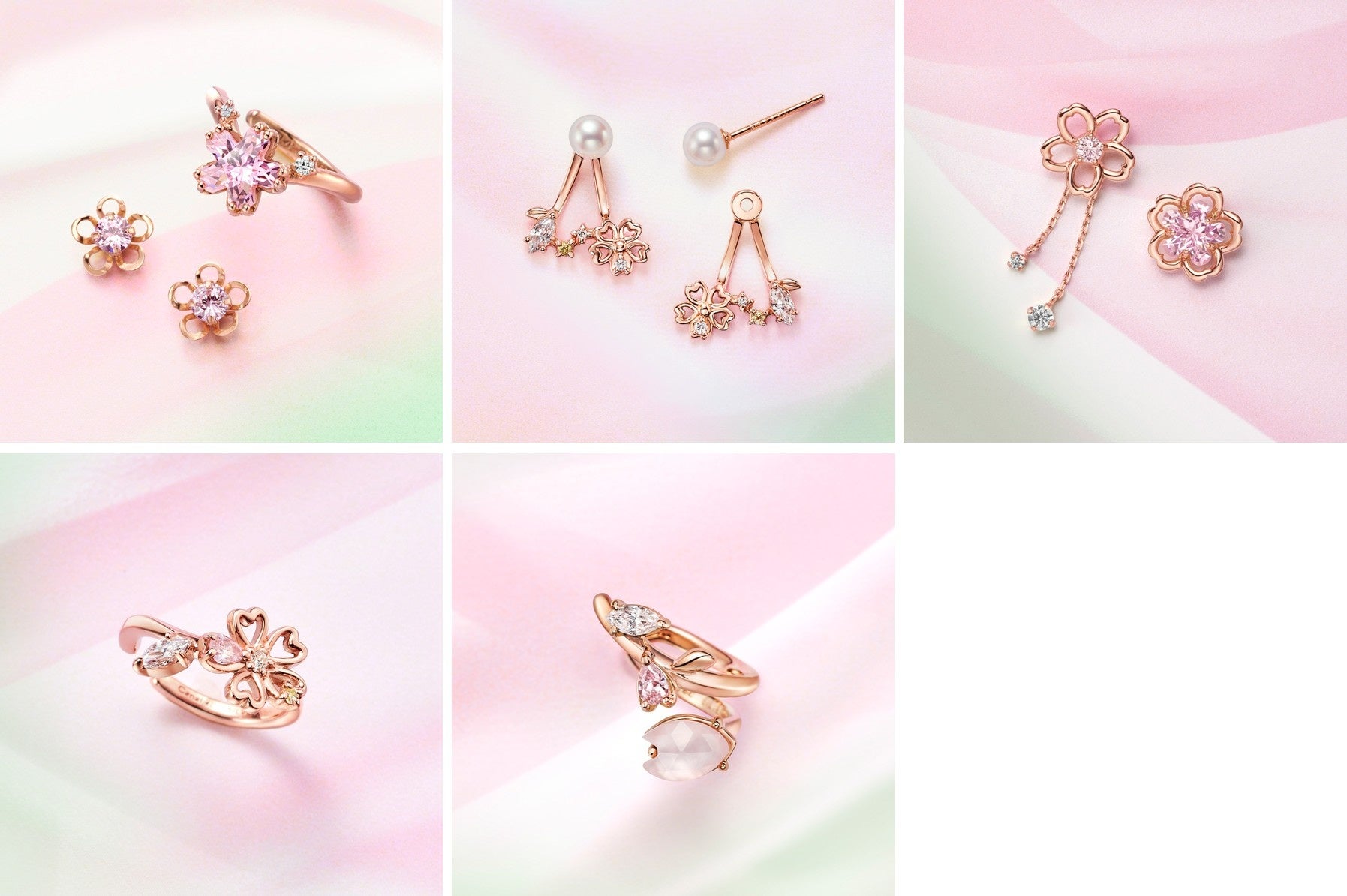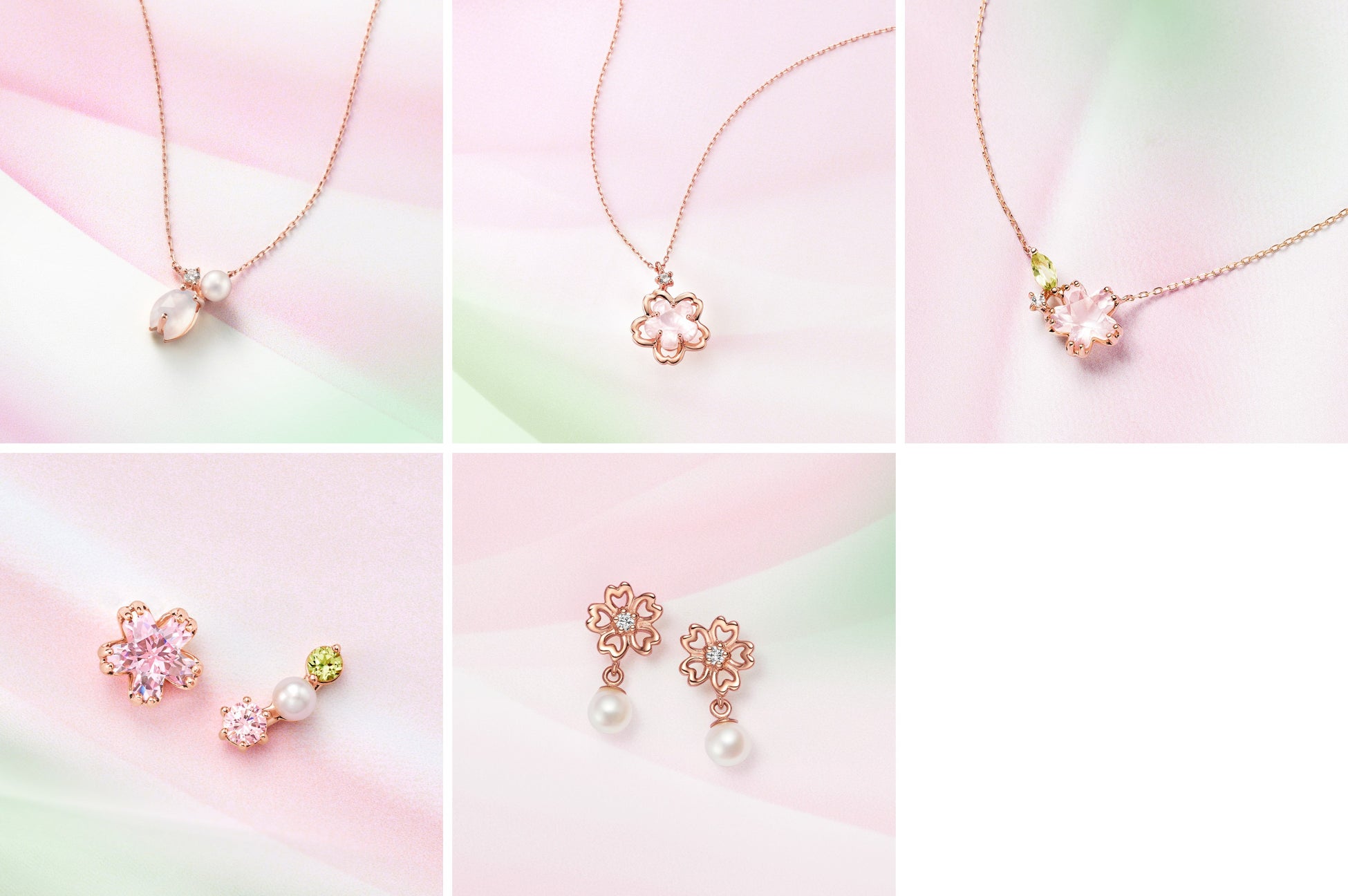 光を浴びて咲き誇る桜の花びらの美しさと愛らしさを、オリジナルカットのローズクォーツやキュービックジルコニアで表現したシリーズや、風に揺れる桜の花やつぼみを表現したセットアイテムや1点でも華やかなイヤーアイテム、重なる花びらや3色団子などお花見の風景を表現したK10を使用したジュエリーなど、春に向けて気分を上げてくれるジュエリーを豊富にラインナップしました。