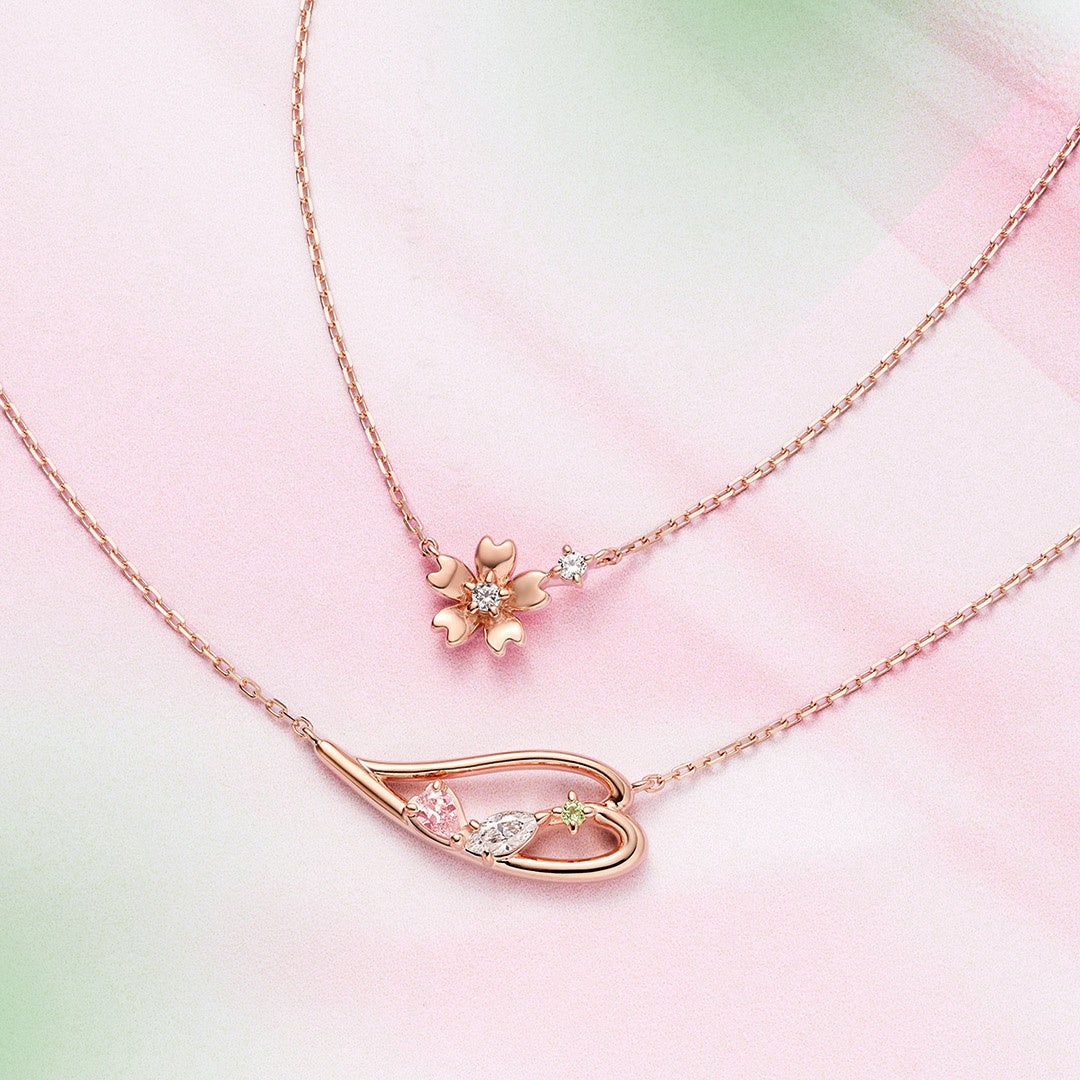 シーンを選ばず身に着けられる桜モチーフのショートネックレスと、春風に揺れる花びらをイメージしたロングネックレスの2本セットのアイテムは、蕾をイメージしたペリドットのアクセントを添え、春の穏やかさを感じる大人っぽく優しいデザインに。満開の桜が咲き誇るお花見の風景をオリジナルカットで表現したネックレスとラリエットネックレスのセットは、組み合わせ次第でコーディネートの幅が広がります。春の訪れを知らせるジュエリーを身に着けて、新たな季節を可憐にコーディネートしてみては。