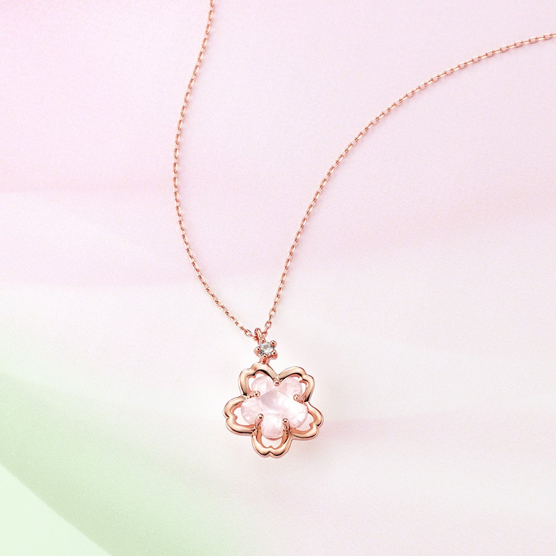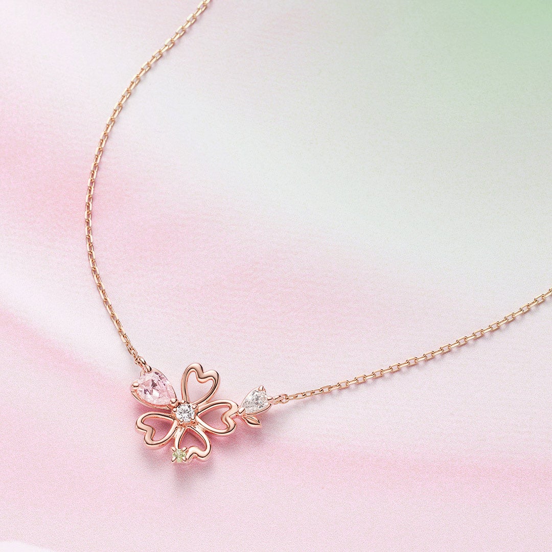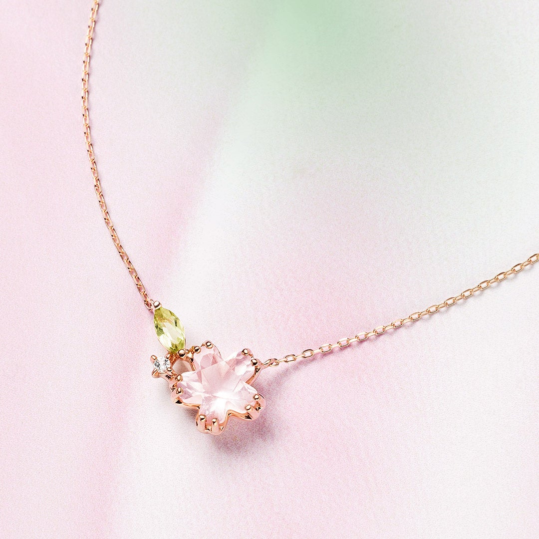 桜の魅せる様々な表情をネックレスで表現したシリーズ。軽やかな桜の花びらを繊細な透かしの地金のラインで象ったネックレスは、つぼみをモチーフにしたペリドットがさりげなく輝く、細部までこだわったデザインです。花びら型のオリジナルカットを施した大粒のストーンをセッティングしたネックレスは、ピンクゴールドカラーの地金がデコルテを華やかに見せてくれます。光を浴びて咲き誇る桜の花をイメージしたネックレスは、程よいボリューム感で、一点でコーディネートに華を添えてくれる主役級のアイテムです。気分に合わせて、お好みのデザインのネックレスを纏って。