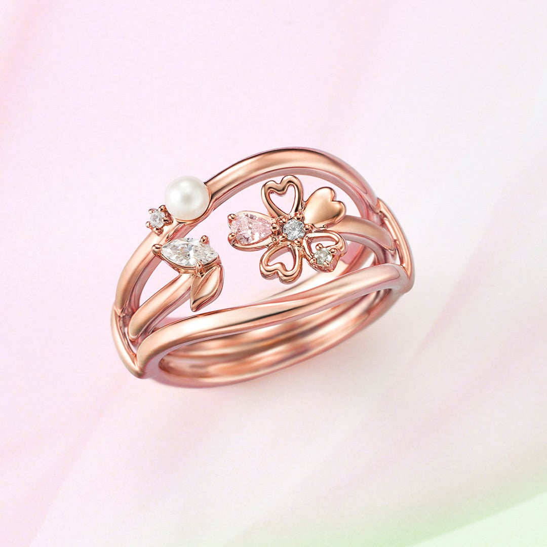オリジナルカットが特別感を演出してくれる華やかなリングやブレスレットもラインナップ。パールを添えたシンプルな2連風リングとトレンド感のあるオープンリングの2本セットは桜が咲き誇る様子をイメージ。組み合わせによってコーディネートの幅が広がります。繊細なデザインが手元を大人っぽく彩るリングは、地金の曲線ラインが美しいデザインで、手元を柔らかく包み込んでくれます。花びらが舞う風景から着想を得たブレスレットは、アクセントのパールが上品な印象をプラスし春先の腕周りを華やかに演出してくれます。春の訪れを知らせるジュエリーで、手元まで可憐にコーディネートしてみては。