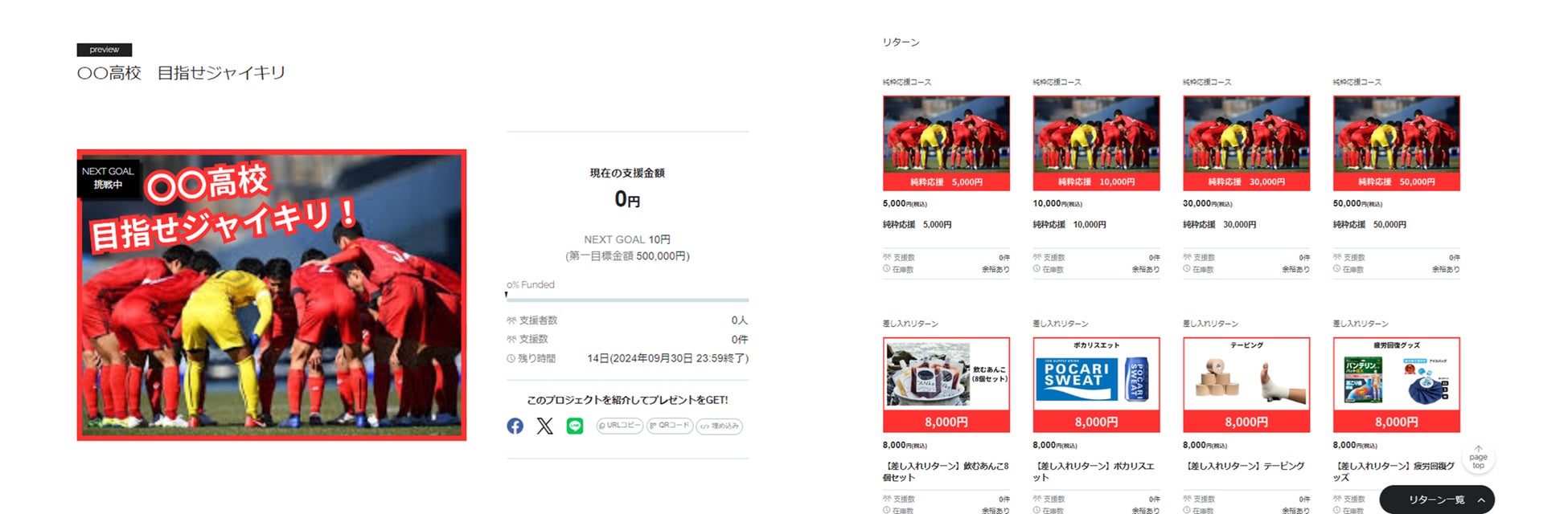 今回の利用を見据えた第103回全国高校サッカー選手権大会のように、準備期間が短く、クラウドファンディングの実行者経験の少ない方へ向けて、予め用意されたテンプレートに必要な情報や画像素材などの提供が可能であれば、最短3日程度でプロジェクトがスタートできる「爆速スタートキット」を用意しました。これにより、より多くの方々にスポチュニティにてクラウドファンディングを実施いただくことが可能となります。