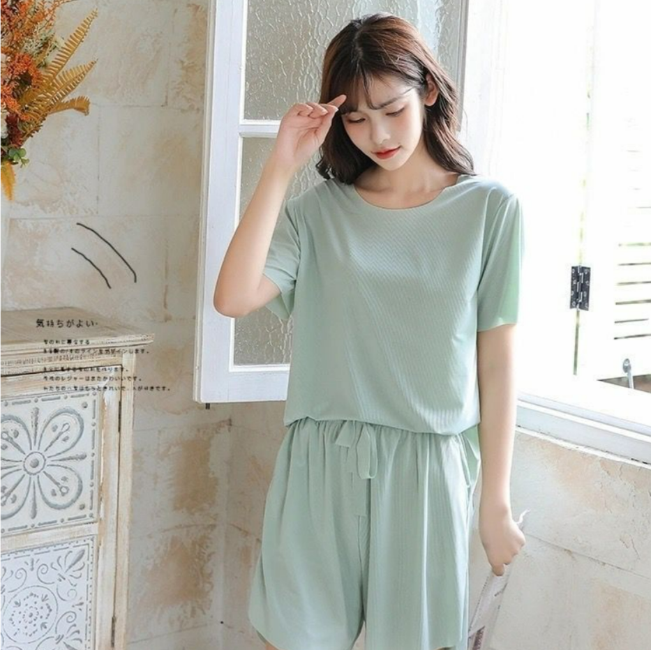 上下セットアップになっており、とろみのある接触冷感素材で気持ちよく着られるルームウェア。ボトムスは2タイプから選べる。