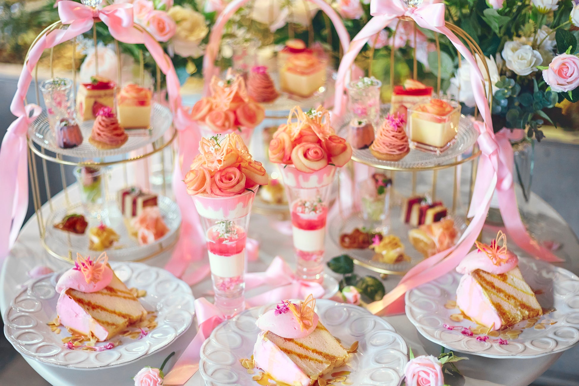 花々の美しさと優雅な味わいが融合した「フラワーブーケアフタヌーンティー」は、玉艶プリンやカヌレ、桜と和栗のモンブランなど春を感じさせる華やかなデザートに洗練された味わいを楽しめるセイボリーをラインナップ。蝶のチュイールやエディブルフラワーが華やかに飾られた「フラワーブーケパフェ」は花々の中で甘い蜜を求める蝶が舞うような幻想的な雰囲気を演出し、華やかな香りと色彩を思わせる風味が口いっぱいに広がります。