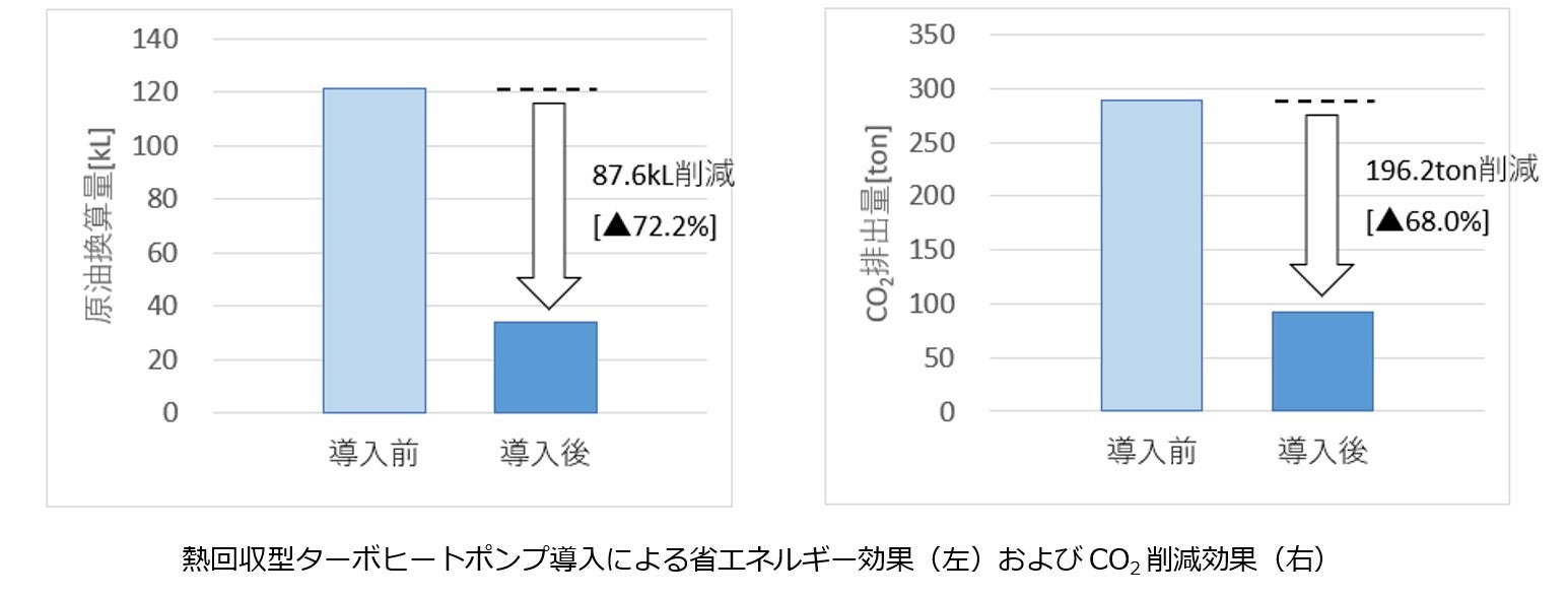 受賞内容は、トヨタ自動車北海道株式会社(社長:北條 康夫氏、本社:北海道苫小牧市)が有する自動車部品製造工場の新たな暖房用熱源として、定格加熱能力2,404kWの高効率な熱回収型ターボヒートポンプを追加導入したことに伴う既設暖房設備の省エネルギー化に関するものです。これにより、既設の暖房用熱源である重油ボイラーとガスボイラーから供給される蒸気使用量および化石燃料消費量を低減しました。また、水冷式空気圧縮機の冷却水を排熱源とすることで低圧縮比での運転が可能となったことから、平均加熱COP※1も7.89を実現。2021年2月の設備引渡しから26日間で、原油換算で87.6kLの省エネルギー効果(削減率72.2%)ならびに196.2トンのCO2削減効果(削減率68.0%)を達成しています。
