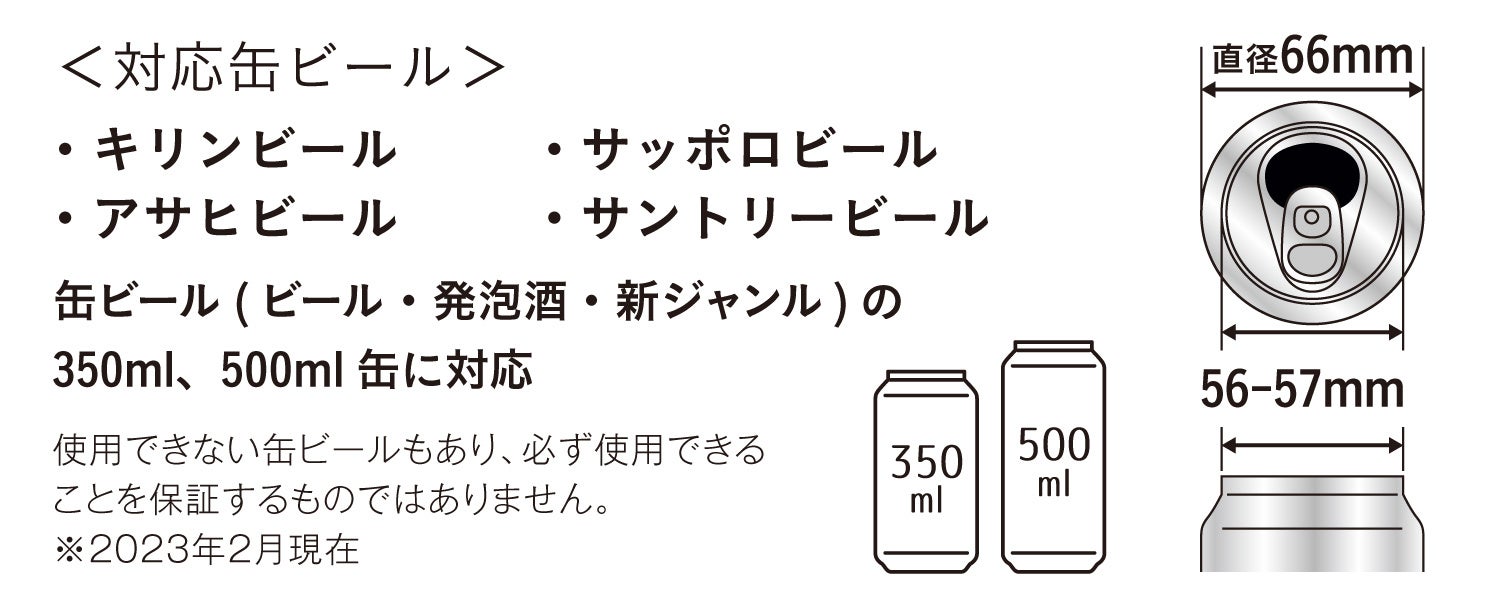 ビール、発泡酒、新ジャンルの350ml、500mlで使われている直径66mmの缶ビールに対応しています。※使用できない缶ビールもあります。ノンアルコールビールには対応していません。