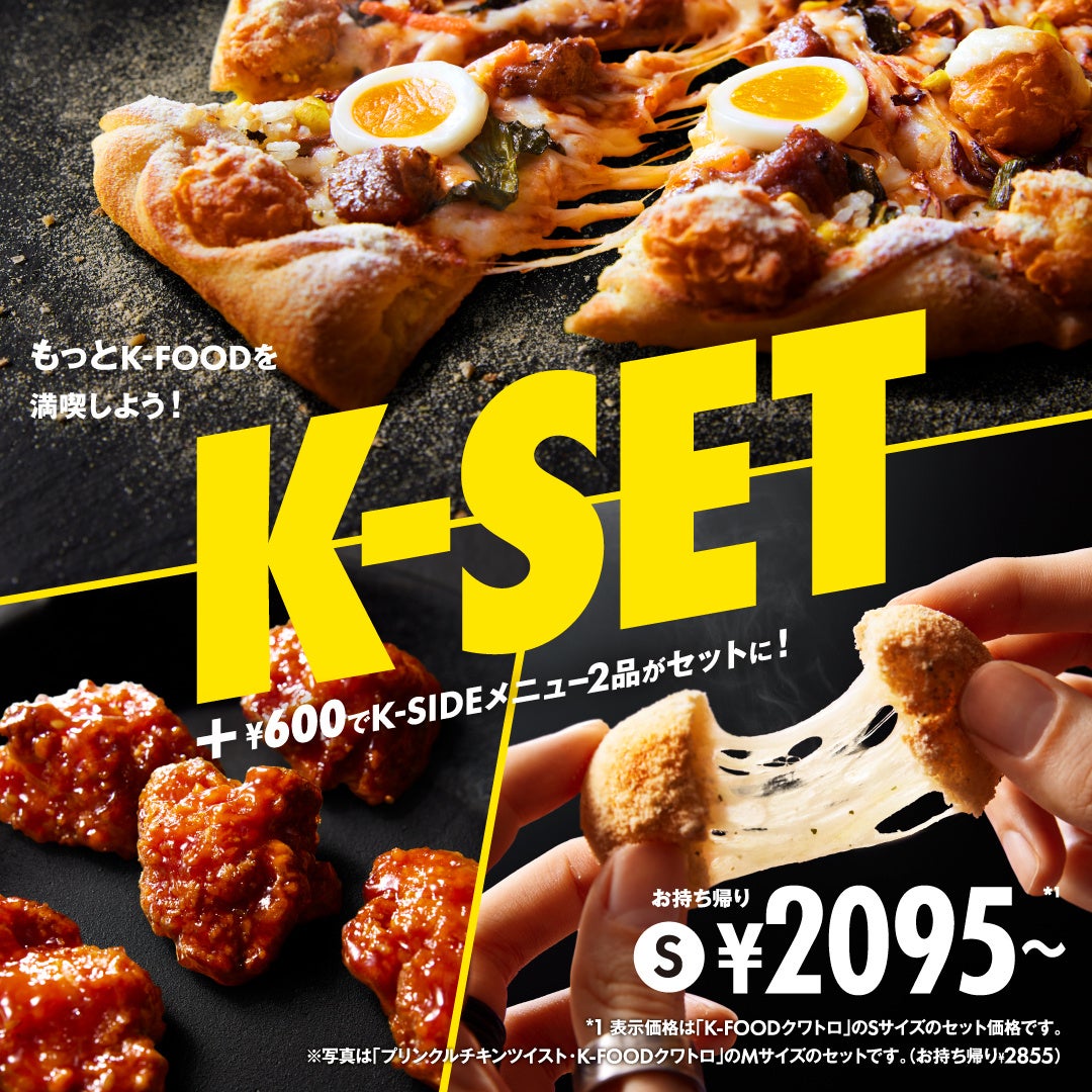 「K-FOODクワトロ」とサイドメニューを、全部楽しみたい!という韓国グルメファンの皆さまのために、ピザとサイドメニューのおトクなセット「K-SET」をご用意しました。「K-FOODクワトロ」ピザに、期間限定のサイドメニュー2品がセットになって、なんとお持ち帰り2,095円~。おトクなセットで、韓国グルメをとことんご満喫ください!