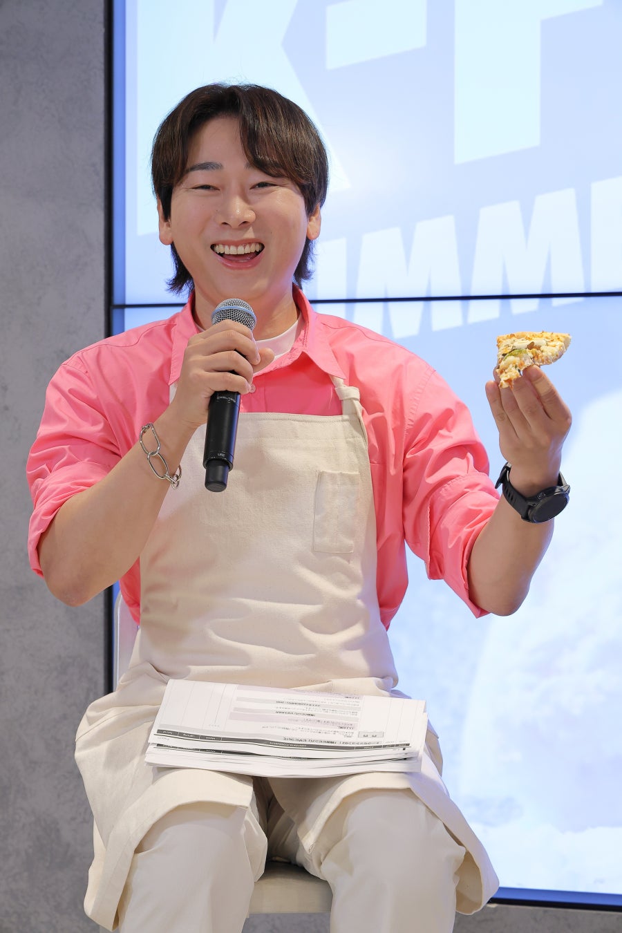 「K-FOODクワトロ」の第一印象について「ピザにビビンパをのせたの!?どうやって!?パンとお米って全然食感が違うからどんな食感になるのか、想像がつかないし、韓国でも見た事がない!」と、まずはお米をピザにのせた「韓国ビビンパ」に驚き、興奮気味にトーク。実際に「韓国ビビンパ」を試食すると、「日本人が好きな味付けにまとまっていて凄い!韓国出身の皆さんにもぜひ食べてほしい1枚です!美味しすぎるので、全部食べさせてください!」と、その味わいに太鼓判。最後の一口までその味わいを楽しんでいただきました。ピザ耳にチキンを包み込んでツイストした「プリンクルチキンツイスト・K-FOODクワトロ」についてのトークセッションでは、「韓国でのチキンの楽しみ方は、上にのせたり、何かの中に入れたりする事が多いのですが、まさか、チキンをピザ耳に入れてツイストするなんて・・・日本ならではの職人技術が出ている芸術の商品で、まさに見た目のラスボスです(笑)」と、その見た目と技術を大絶賛。