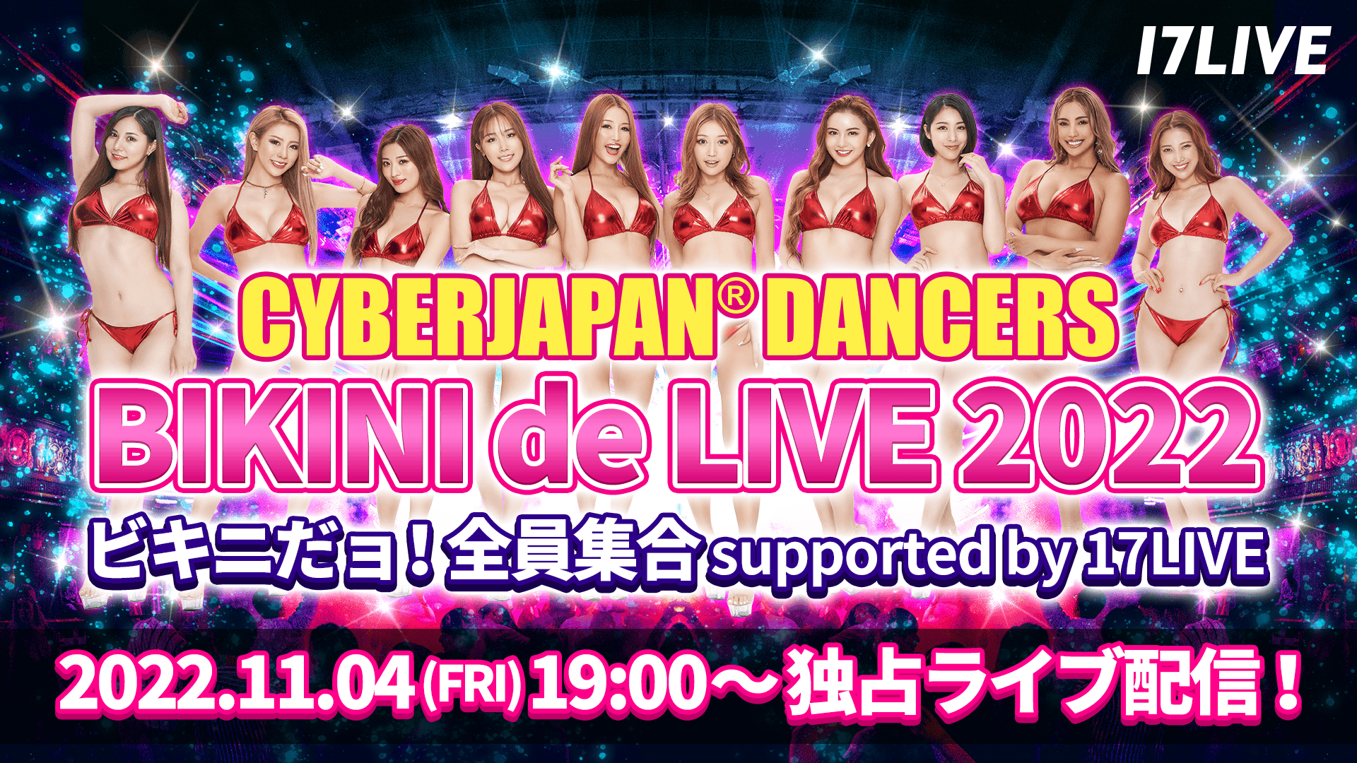 17LIVE株式会社(東京都港区、代表取締役:永野 敬明、URL:https://jp.17.live/)が運営する日本No.1(※1)ライブ配信アプリ「17LIVE」では、ユニバーサル ミュージック合同会社(本社:東京渋谷区、 社長兼最高経営責任者(CEO):藤倉尚)所属の、日本を代表するゴーゴーダンサーチーム「CYBERJAPAN DANCERS」が実施する、今年最後となるワンマンライブ「BIKINI de LIVE 2022 ビキニだョ!全員集合 supported by 17LIVE」を、2022年11月4日(金)19時より「17LIVE」にて独占ライブ配信することが決定しました。さらに、2022年11月12日(土)22時からは、ビキニ姿の「CYBERJAPAN DANCERS」メンバーと一緒にライブ映像を鑑賞しながら、ここでしか見られない企画にも参加できる特別配信『CYBERJAPAN DANCERS 特別配信「BIKINI de Watch Party」』を開催することが決定しましたので、お知らせいたします。