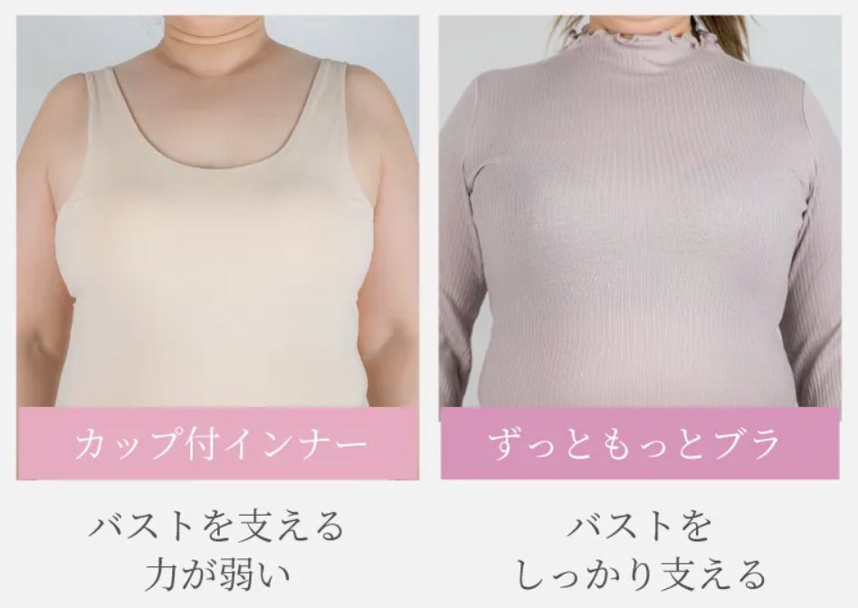 締め付けが感じやすくなり通常のブラは着けられなくなり、優しい着け心地のカップ付きインナーを着用されている方にもストレスなく、着用していただけます。