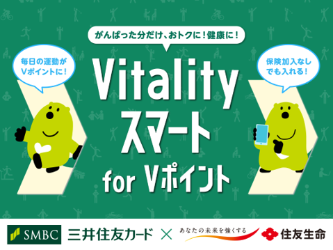 こうした、現在のデジタルベースでのサービス提供の拡大、および社会課題から生じるヘルスケアニーズの拡大を受けた両社が目指す方針として、ヘルスケア領域における社会的価値創造に向けて協業することといたしました。その第一弾として「Vポイント」がお得に貯まる三井住友カード会員様向けの「Vitalityスマート」専用プラン「Vitalityスマート for Vポイント」を提供開始いたします。