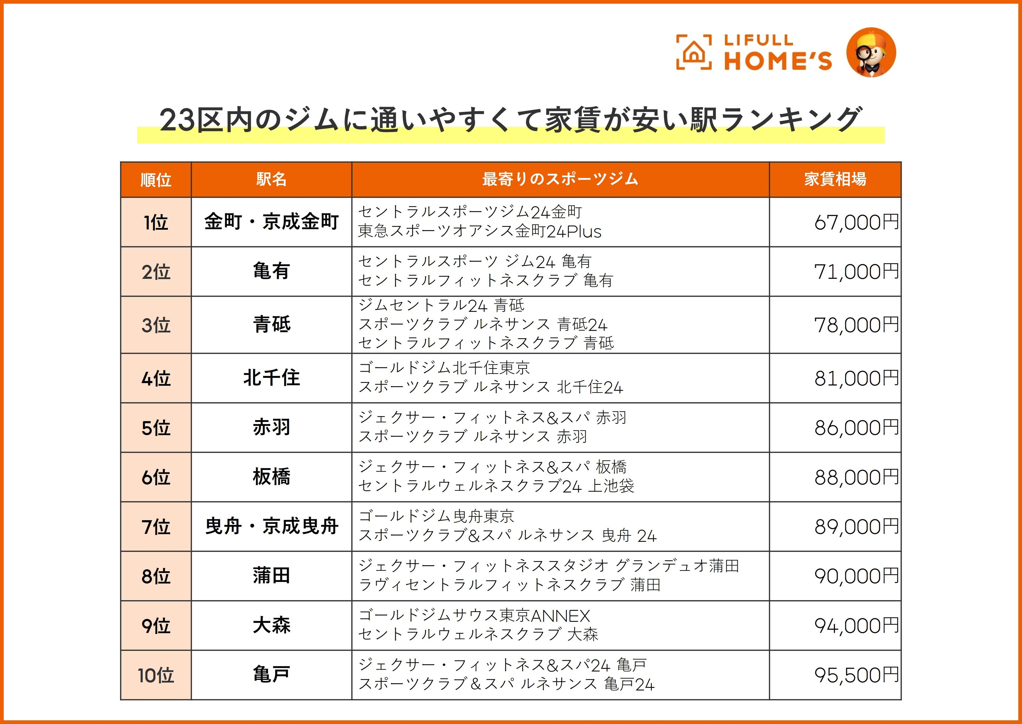 ランクインしたうち、半数以上は城東エリア(「金町駅」・「京成金町駅」、「亀有駅」、「青砥駅」、「曳舟駅」・「京成曳舟駅」、「亀戸駅」)となりました。家賃を抑えながら、ジム通いをしたい人にとって、城東エリアはおススメの地域と言えます。
