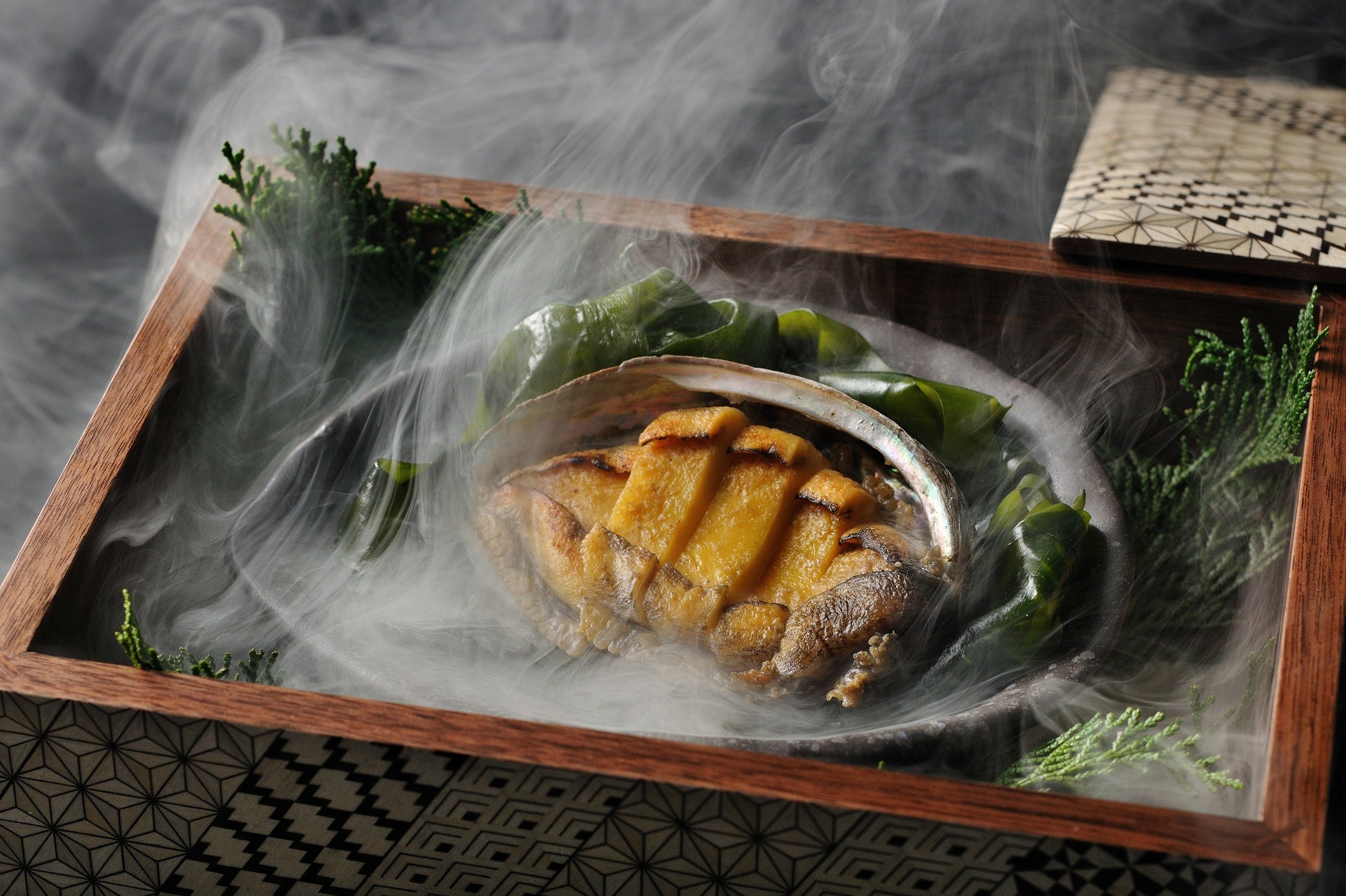 高級食材である鮑をスモークの煙で丁寧に調理した料理です。提供する器は特注した箱根の伝統工芸・寄木細工の器で提供します。寄木細工の蓋を開けると玉手箱のようにスモークの煙が広がり、食欲をそそります。寄木細工の木の色合いや木目のデザインとともに目にも楽しい料理です。
