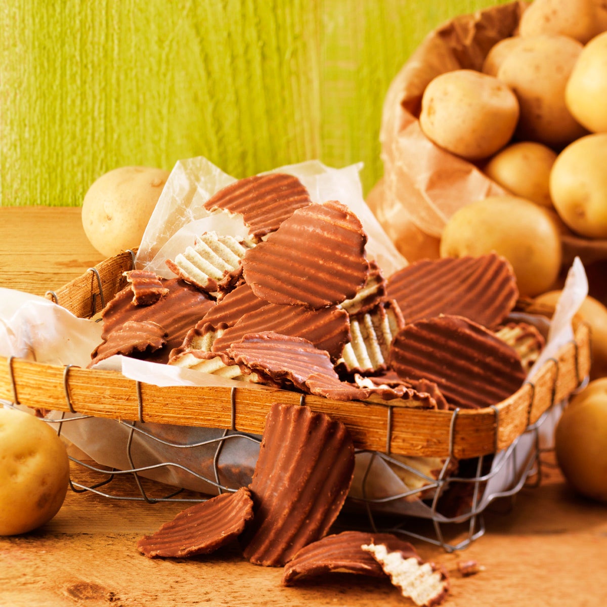 ポテトチップの片面に、カカオの香り豊かな甘さ控えめのチョコレートをコーティングしました。
