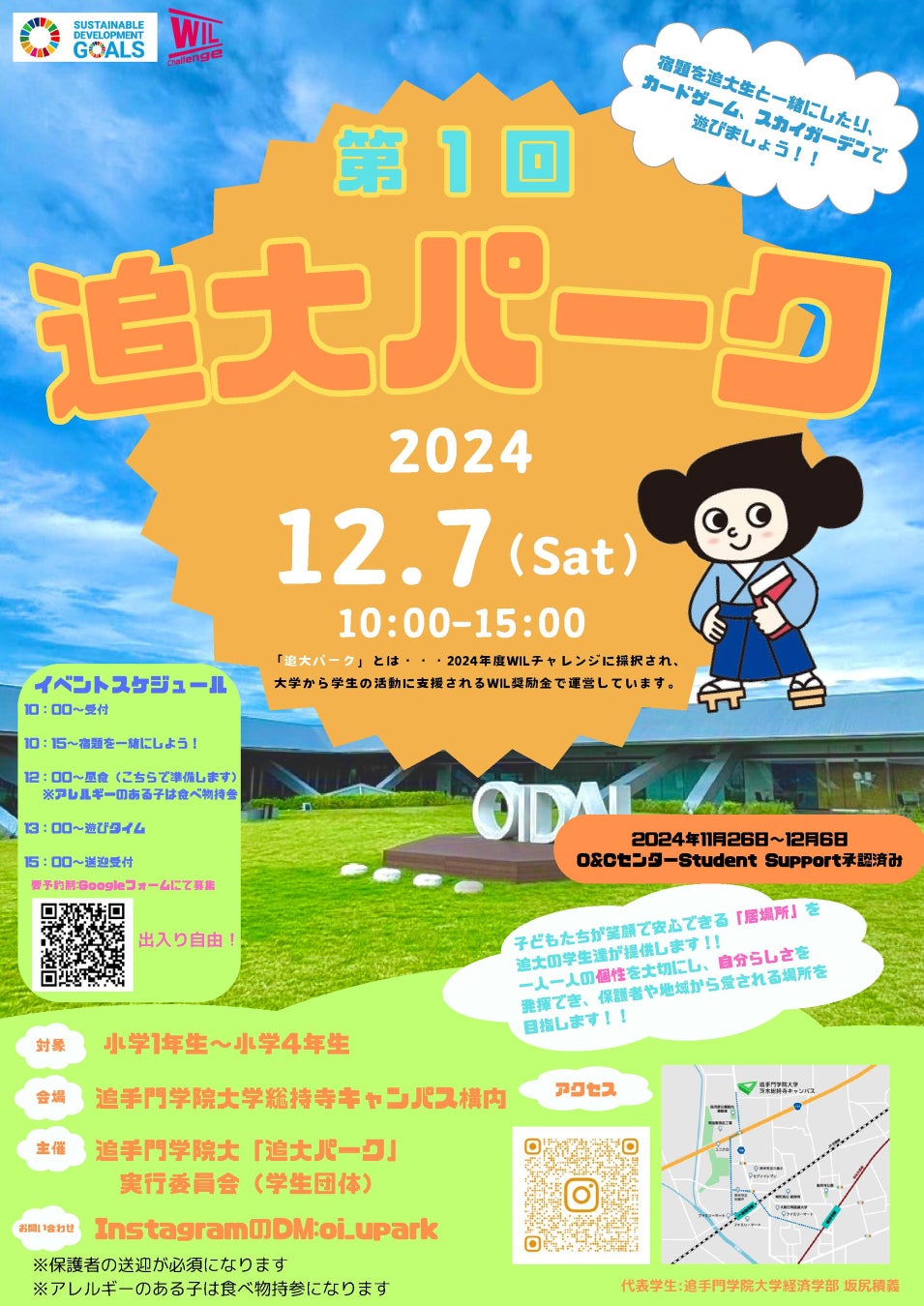 主体的に学び、協働して問題解決にあたる学修スタイルWIL(Work-Is-Learning)を推進する追手門学院大学(略称:追大、大阪府茨木市、学長:真銅正宏)の学生が、少子化や地域のつながりの希薄化、家庭における子育ての孤立などの社会問題から大学を子どもたちの居場所となる新たな「サードプレイス」にしようと、「追大パーク」と題したイベントを追大茨木総持寺キャンパスで12月7日から4回にわたって開催します。