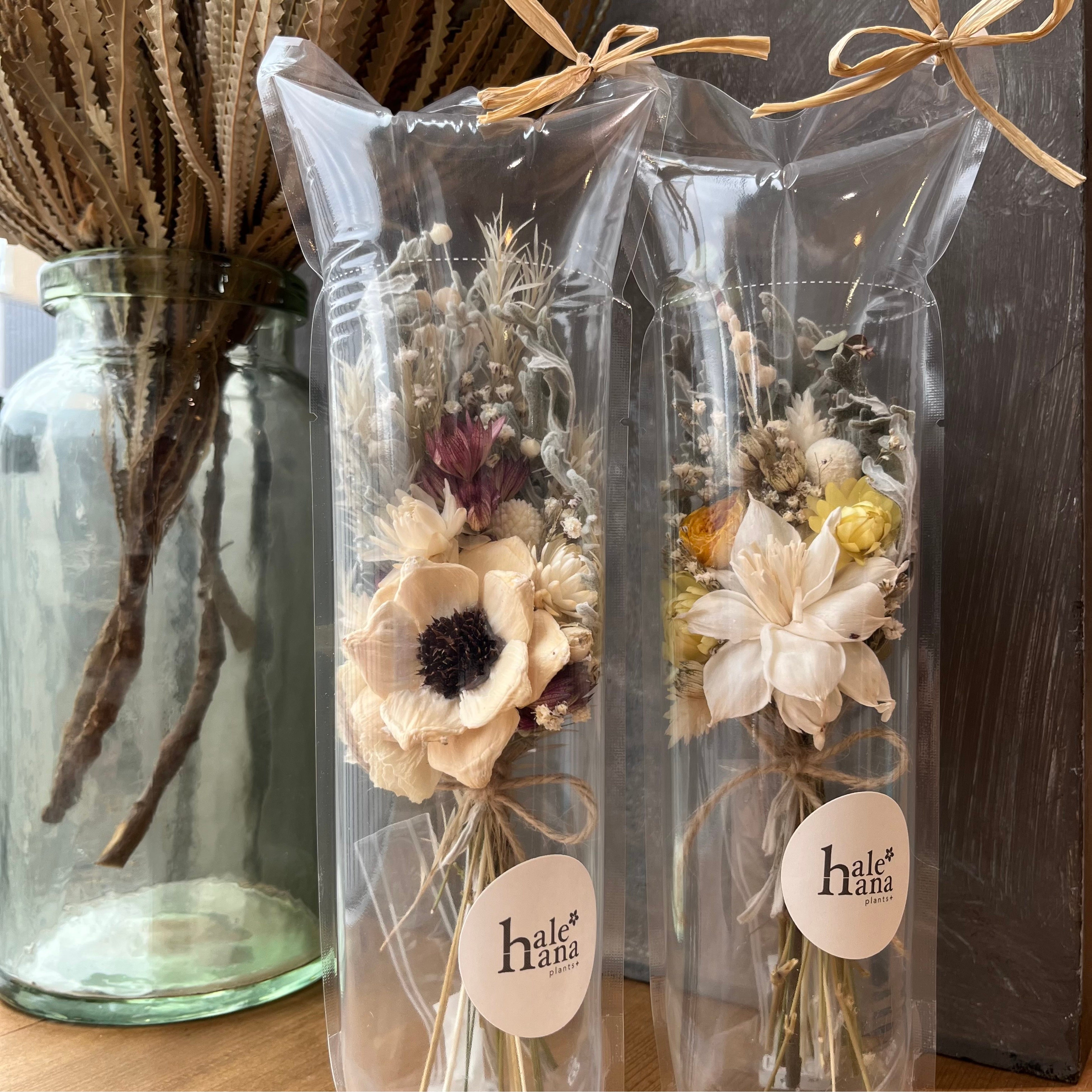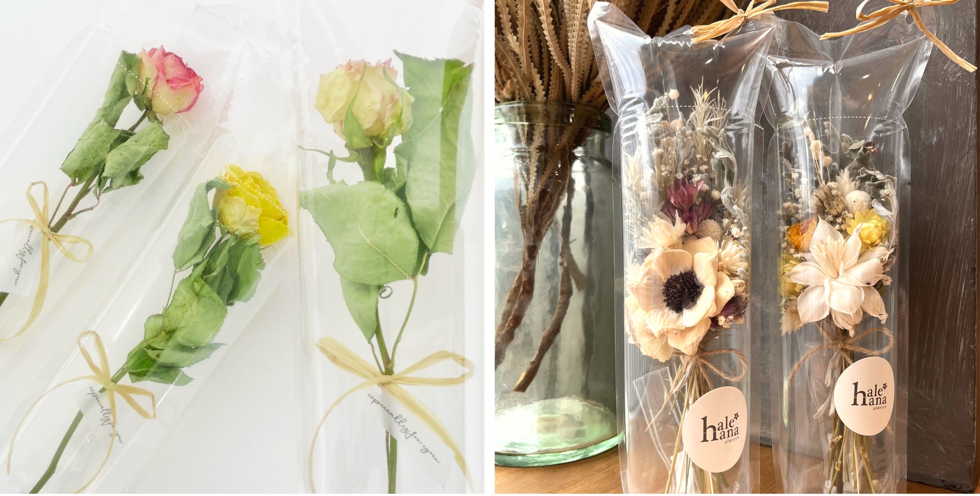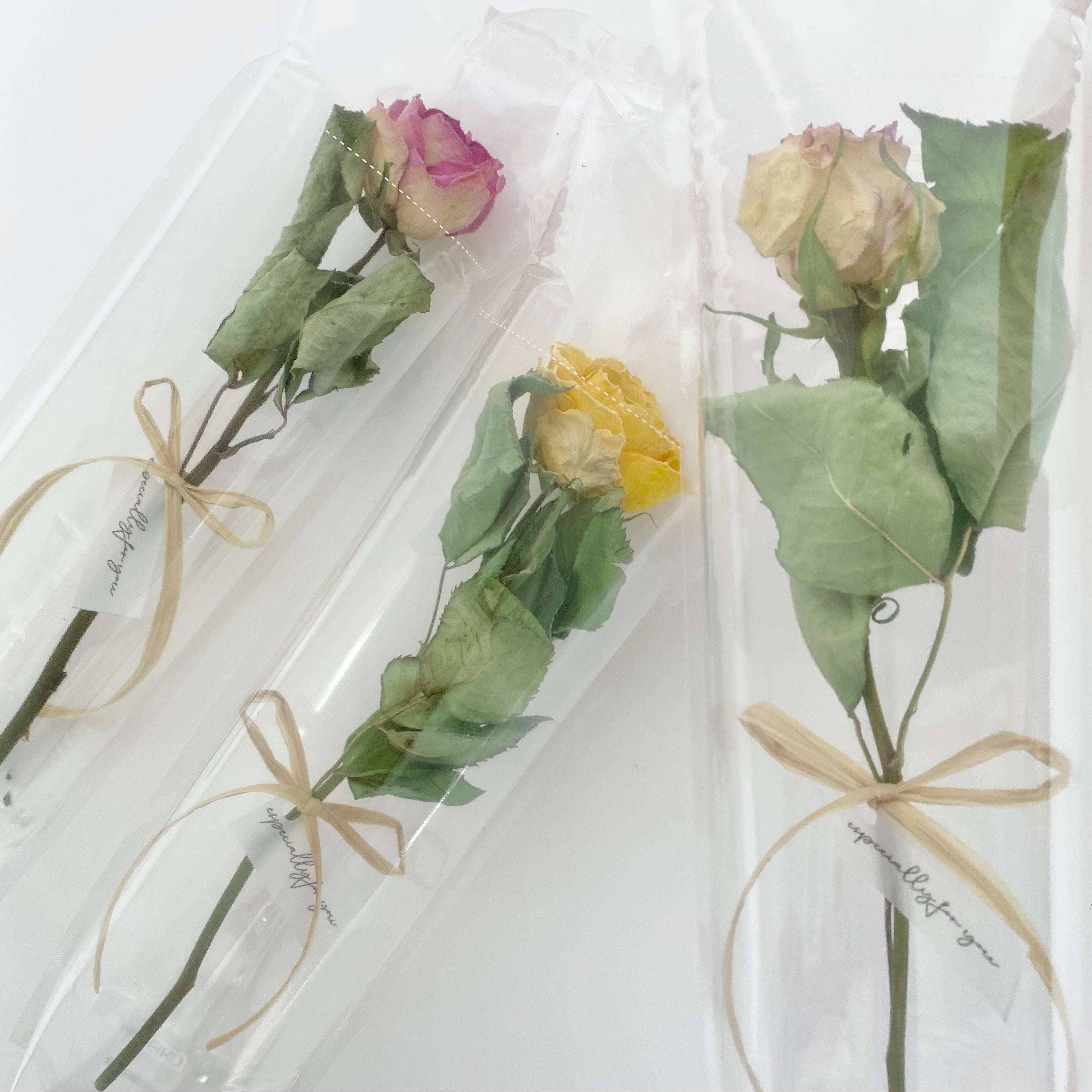 透明なOPPの中に、ドライフラワーをエアーと一緒にふんわりと封じ込めました。ガラス容器を使用しない分、お手頃価格となっており、バラ1輪は500円、アレンジは1,500円での販売予定です。そのまま飾ってもOK、開封してお好みの花器に移して楽しむこともできます。