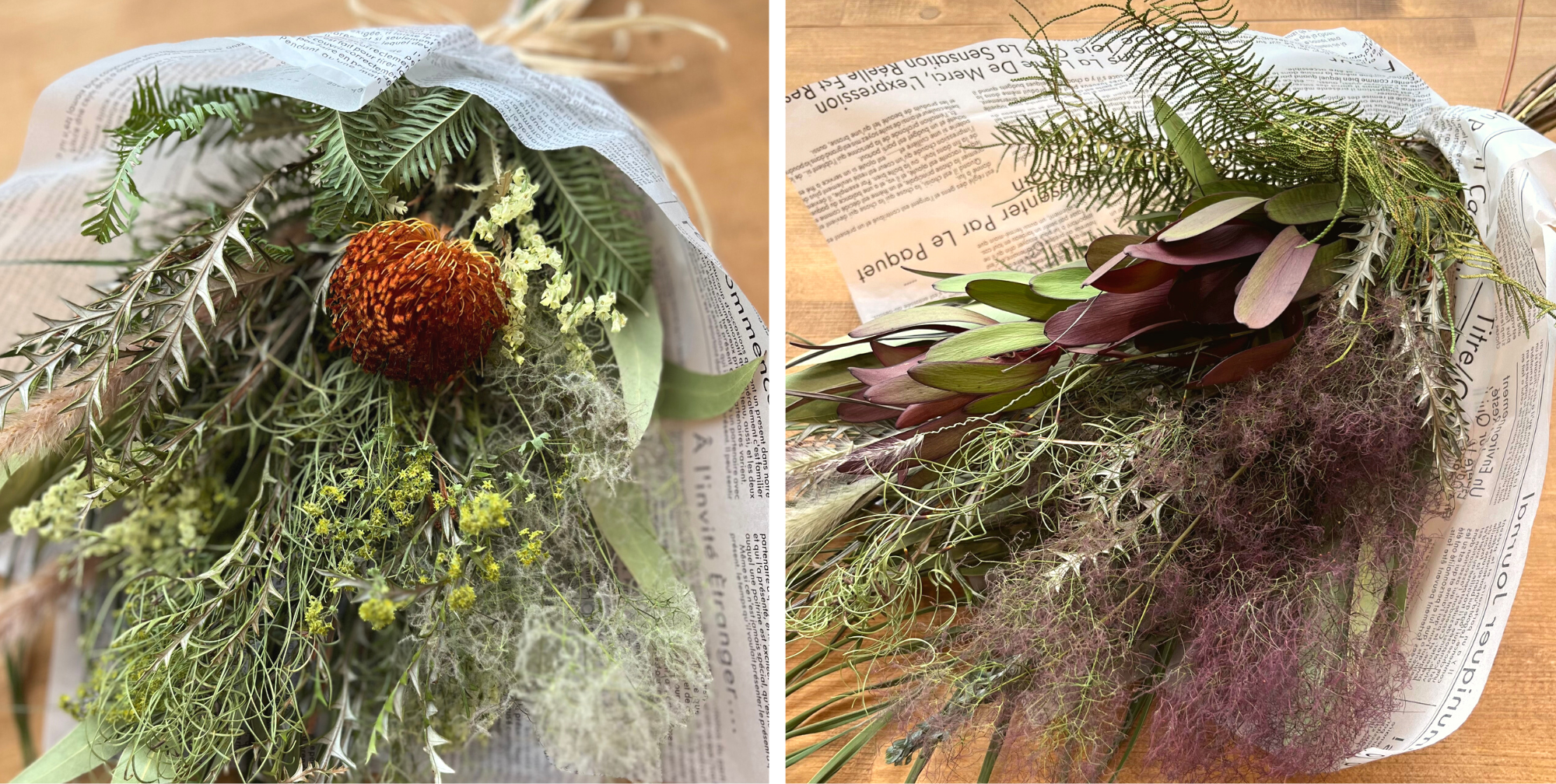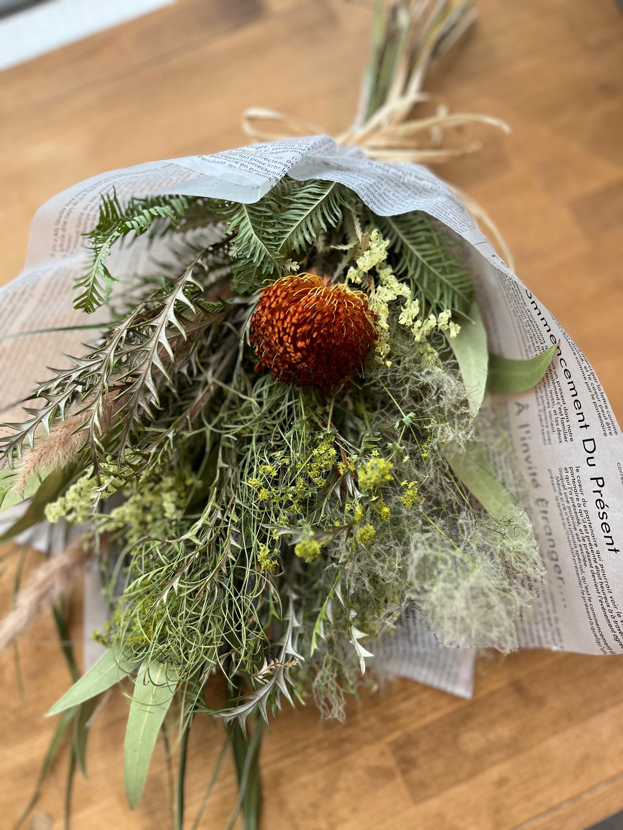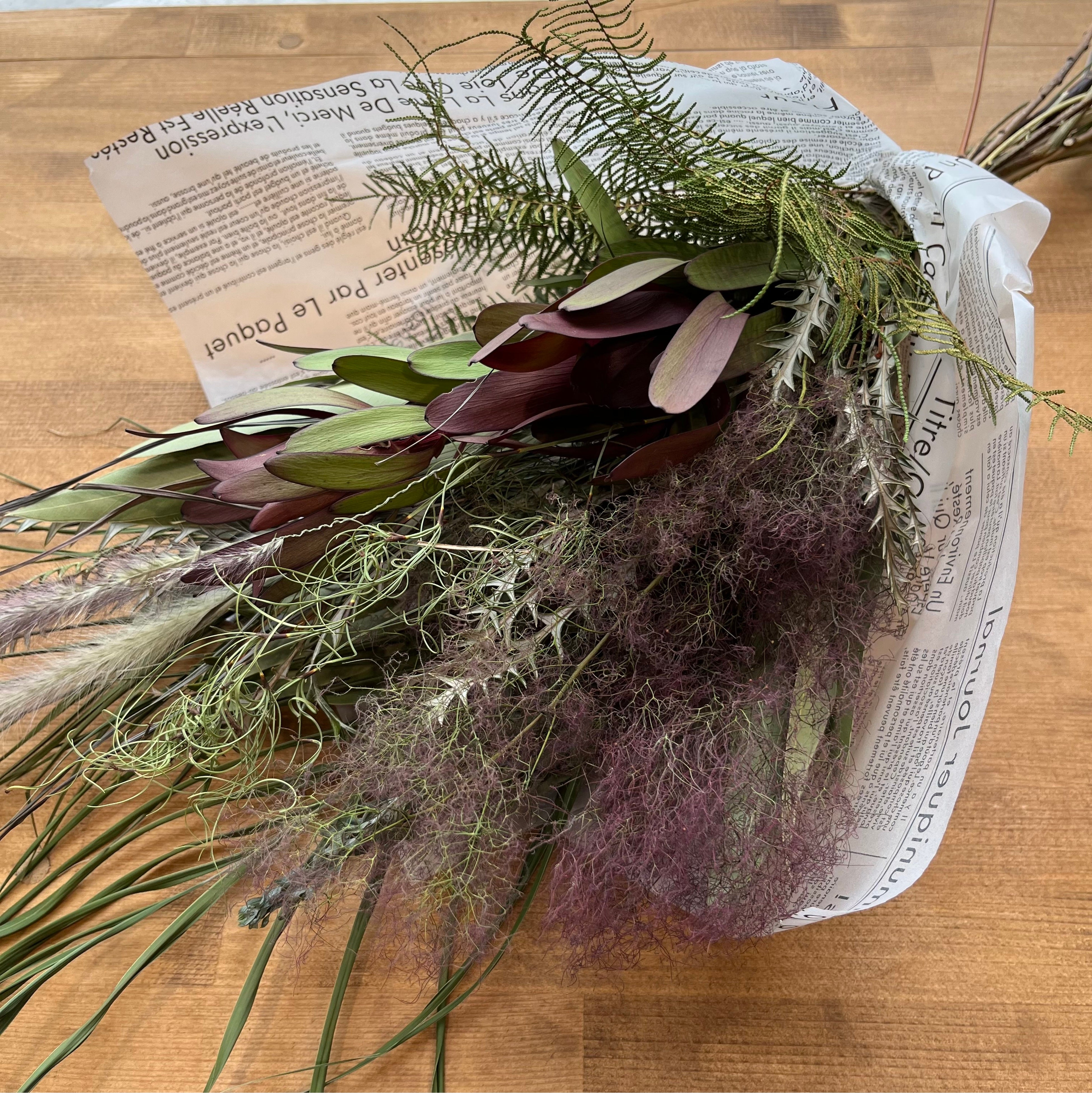 西武“グリーン”マルシェにちなみ、ドライでも青々として退色しにくい花材を用いて、初夏にぴったりの『グリーンブーケ』をご用意しました。お部屋や玄関、リビングに飾るとナチュラルな雰囲気に。スワッグとしてはもちろん、花瓶にたてたり、棚に横に置いたり、インテリアに合わせてご利用いただけます。お手入れ要らずでさわやかな印象のブーケは、プレゼントにもおすすめです。