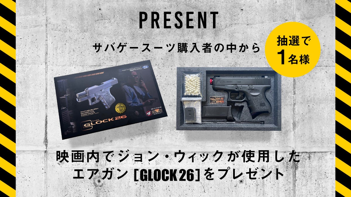 クラファンサイト「BOOSTER」にて「WWS×ASOBIBA サバゲースーツ」を購入した方の中から抽選で1名様に、有名アクション映画内で使用しているエアガン「GLOCK26」をプレゼントいたします。