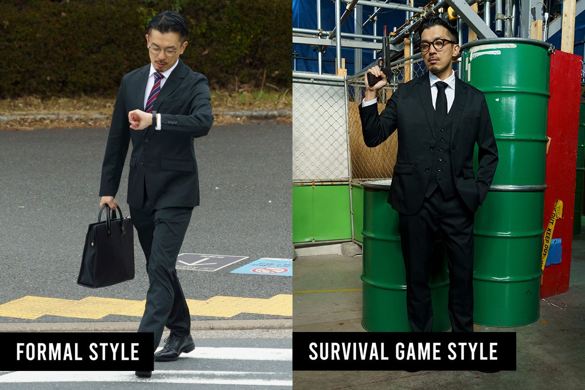 今回のサバゲースーツは、スーツ着用による動きの制限やケアの手間など「スーツサバゲー」の抱える課題をWWSの機能性で解決し、誰でもより気軽に「スーツサバゲー」を楽しめるようにという想いで、サバゲーフィールド「ASOBIBA」とのコラボが実現し開発に至りました。また、開発に当たり実際に「スーツサバゲー」プレイヤーにも意見を求め、“外見はシンプルかつスマートなスーツ、内側に多様なギミックを搭載”しました。