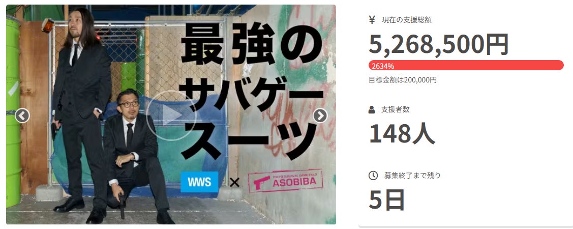 サバゲーフィールド「ASOBIBA」と共同開発した、日本初となる「サバゲースーツ」の売上総額が500万円を突破したことをお知らせいたします。同商品は、クラファンサイトBOOSTERにて2023年5月20日(土)23:59まで先行販売いたします。また、5月20日(土)までにサバゲースーツを購入した方の中から抽選で1名様に、有名アクション映画内で使用しているエアガン「GLOCK26」をプレゼントいたします。