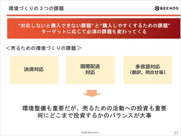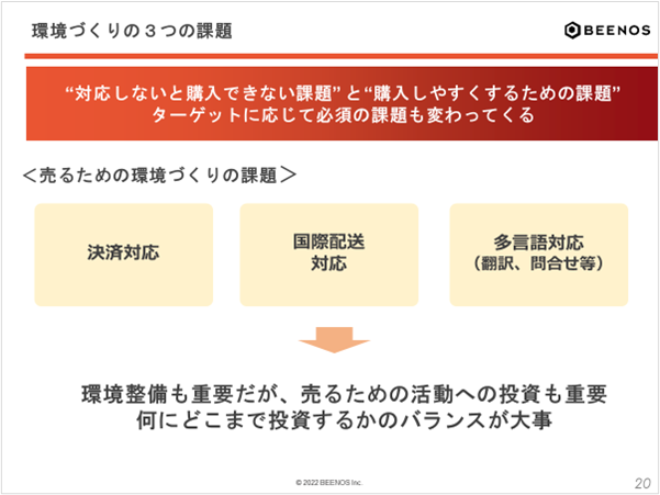 「売るための環境づくり」においては、ユーザビリティを意識した決済手段の導入や問い合わせなどの多言語対応が必要になってきますが、対応できる幅を広げればその分必要なコストも増大します。海外ユーザーに商品を販売するためには環境づくりのほかにブランディングやプロモーション、商品開発も重要な活動です。環境整備、施策についてどこまで投資するかのバランスがポイントになります。