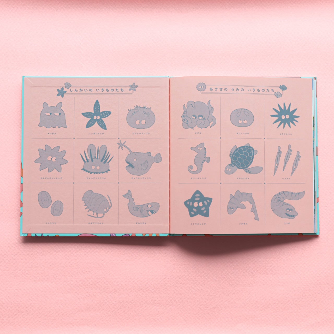 絵本の見返しには、この絵本に登場する深海や浅瀬に住む生き物たちのイラストが書いてあるので、絵本のどこに登場するか、お子さんと一緒に探して楽しむこともできます!
