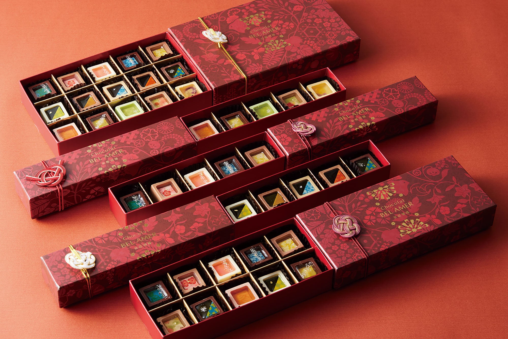 ショコラとフルーツや金胡麻、お茶などを組み合わせ、和素材が引き立つ全12種の味わいをお届けします。