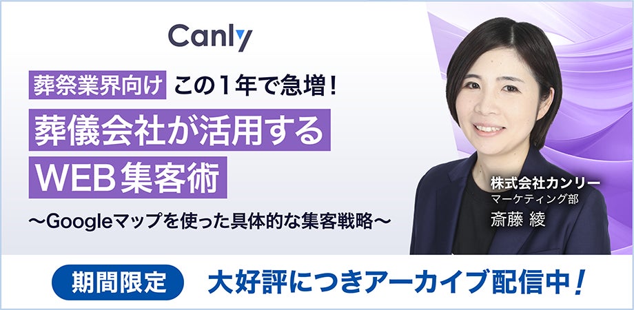 Googleビジネスプロフィール・HP・各SNSの一括管理サービス「カンリー店舗集客」の開発・提供を行う株式会社カンリー(所在地:東京都品川区、代表取締役:辰巳 衛,秋山 祐太朗)は、2025年4月23日(水)に行われたウェビナー『葬祭業界向け、この1年で急増!葬儀会社が活用するWEB集客術〜Googleマップを使った具体的な集客戦略〜』をご好評につき無料配信することとなりましたのでご案内いたします。