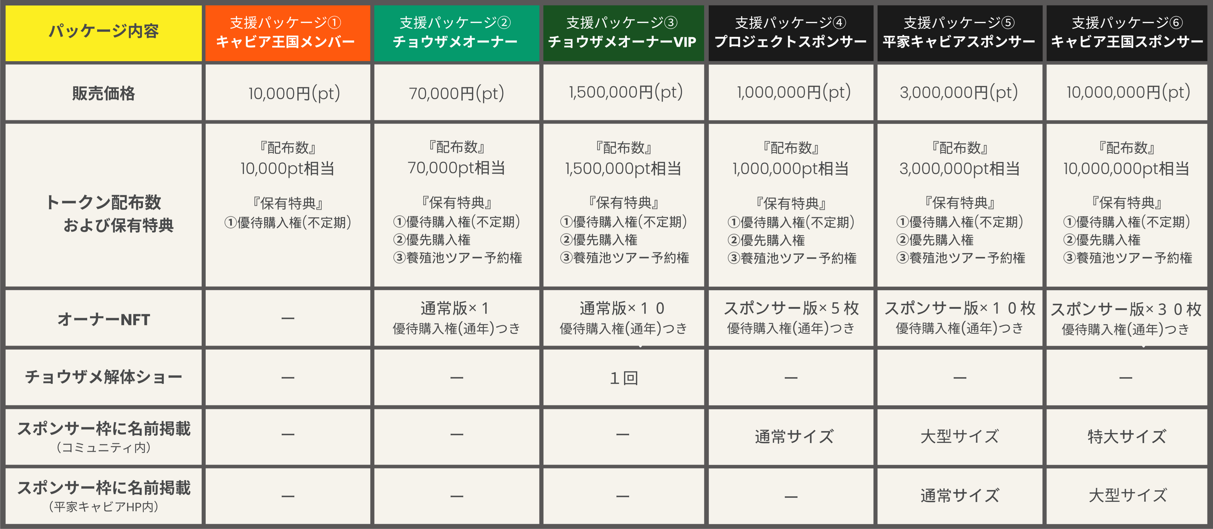 今回実施するファンディングでは、6つの支援パッケージを販売します。支援金額分のトークンを受け取ることができ、チョウザメオーナーであることを証明するアイテム「オーナーNFT」などの支援特典も獲得できるこの機会に是非支援をご検討ください。
