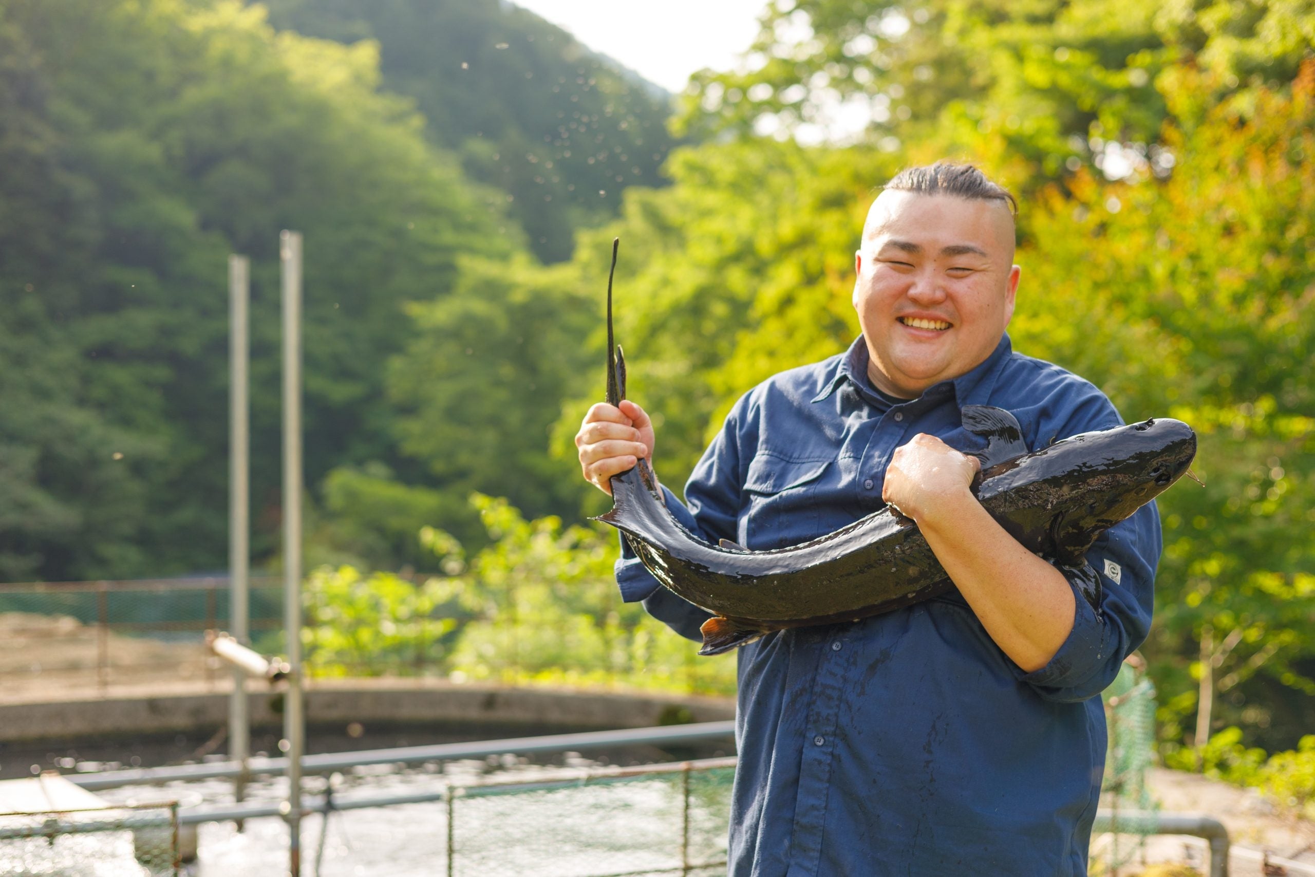 日本三大秘境と呼ばれる宮崎県椎葉村で、チョウザメの養殖とキャビアの製造を行う株式会社キャビア王国の国王・鈴木 宏明。椎葉村に生まれ、大学卒業後NTT東日本に就職も留学を機にUターン。その後家業の建設業のかたわら、2008年からチョウザメ養殖業に従事。試行錯誤を繰り返して、臭みがなく日本人の舌に合う「平家キャビア」という自社ブランドを立ち上げ、国内の有名レストランに多数採用。その後都農ワインを使った世界初のキャビアにフレーバーを付ける技術を開発。2021年7月に都農ワインキャビアの製造工場として株式会社キャビア王国を建国。