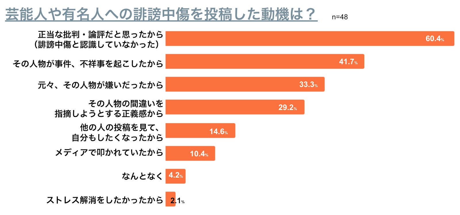 芸能人や有名人に誹謗中傷を投稿した動機を尋ねた(複数回答可)ところ、「正当な批判・論評だと思ったから(誹謗中傷と認識していなかった)」が60.4%でもっとも多く、「その人物が事件、不祥事を起こしたから」が41.7%と続き、投稿した当時には、正当なものだと認識していた実態が浮き彫りになりました。