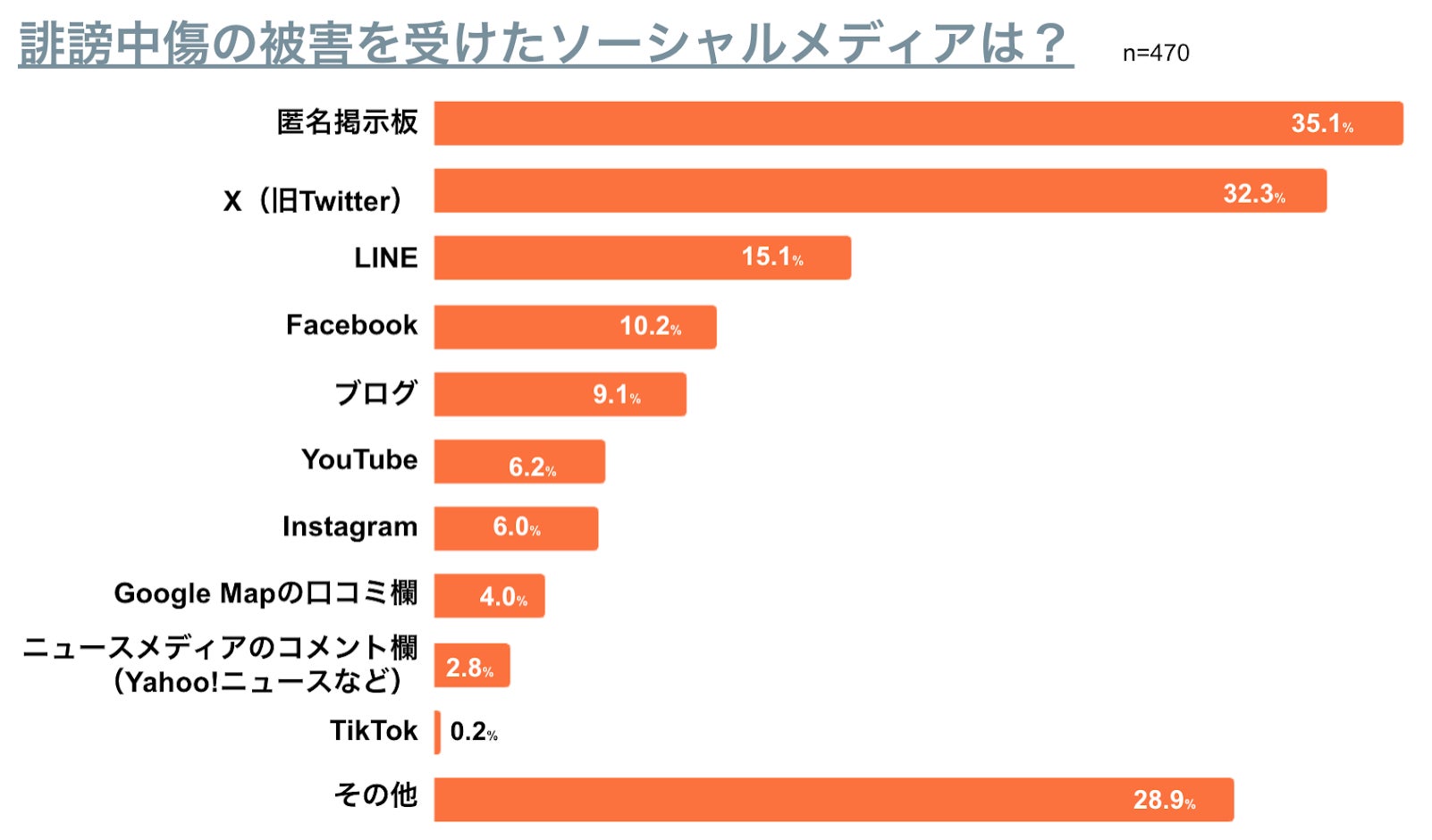 誹謗中傷を受けたソーシャルメディアを尋ねたところ、「匿名掲示板」が35.1%、「X(旧Twitter)」32.3%、「LINE」が15.1%、「Facebook」が10.2%、「ブログ」が9.1%、「YouTube」が6.2%、「Instagram」が6.0%、「Google Mapの口コミ欄」が4.0%、「ニュースメディアのコメント欄(Yahoo!ニュースなど)」が2.8%、「TikTok」が0.2%、「その他」が28.9%となりました。