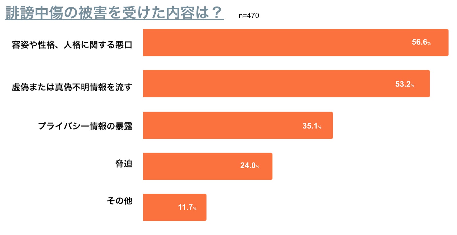 被害者に誹謗中傷の内容を尋ねたところ、「容姿や性格、人格に関する悪口」が56.6%、「虚偽または真偽不明情報を流す」が53.2%、「プライバシー情報の暴露」が35.1%、「脅迫」が24.0%、「その他」が11.7%と続きました。
