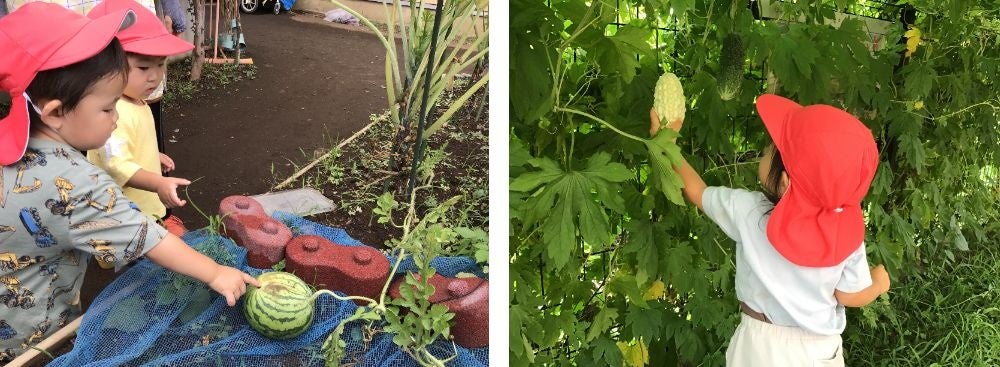 例えば、園の夏祭りで「スイカ割りがしたい!」という声があって、スイカを栽培することになったり、ハロウィンパーティーで「かぼちゃのお化けを作りたい!」という声からかぼちゃを栽培することになったり…。夜まで預かる延長保育のイベントがあった時は「みんなで夜にピザが食べたい!」という声があり、「ピザに何のせたい?」と聞いたら、トマトや玉ねぎが出てきたから、それらを栽培することにしました。栽培の目的をはっきりさせてから野菜を植えることで、植物や食べ物に対する想いも育まれ、食育にもつながりますね。