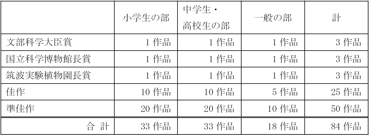 審 査:審査員が、植物学・美術・教育の立場から、観察の注意深さ、表現の正確さ、芸術的な美しさなどを基準として、令和3年11月26日(金)に国立科学博物館総合研究棟会議室において審査を行った。