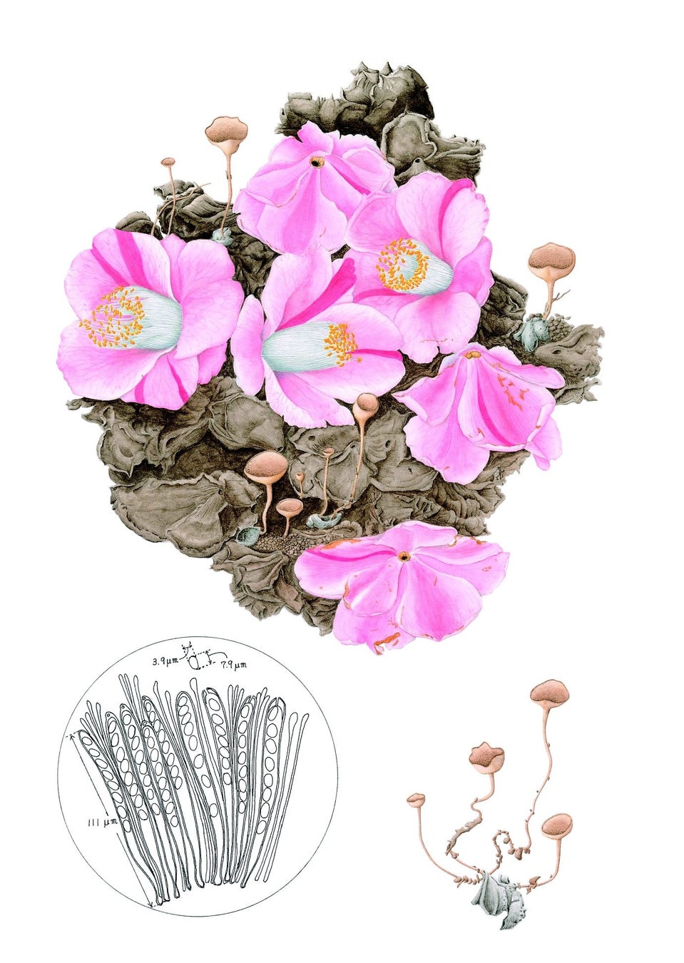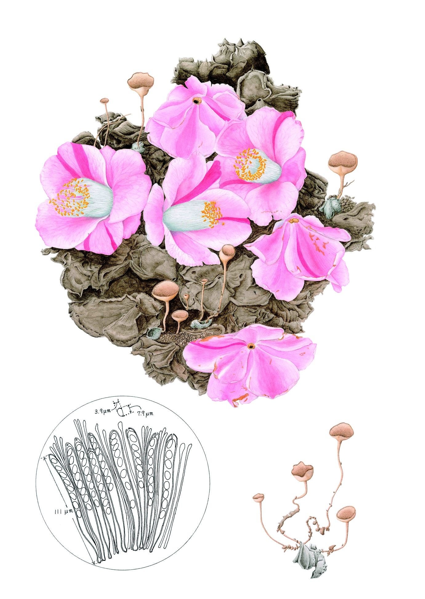 サイエンスと アートが上手く融合されて全体像が描かれた、素晴らしい構図の作品である。植物と菌類の関わりがよく表現されている。