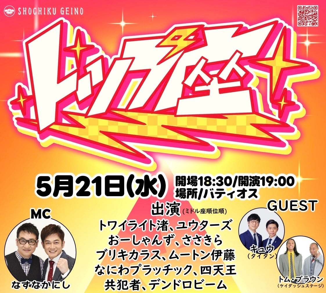 <5/21(水)開催>事務所ライブ「トップ座」がリニューアル!今回から1対1のガチンコバトル対決に。初回のMCは『なすなかにし』。ゲストに『キュウ』『トムブラウン』の出演も決定!