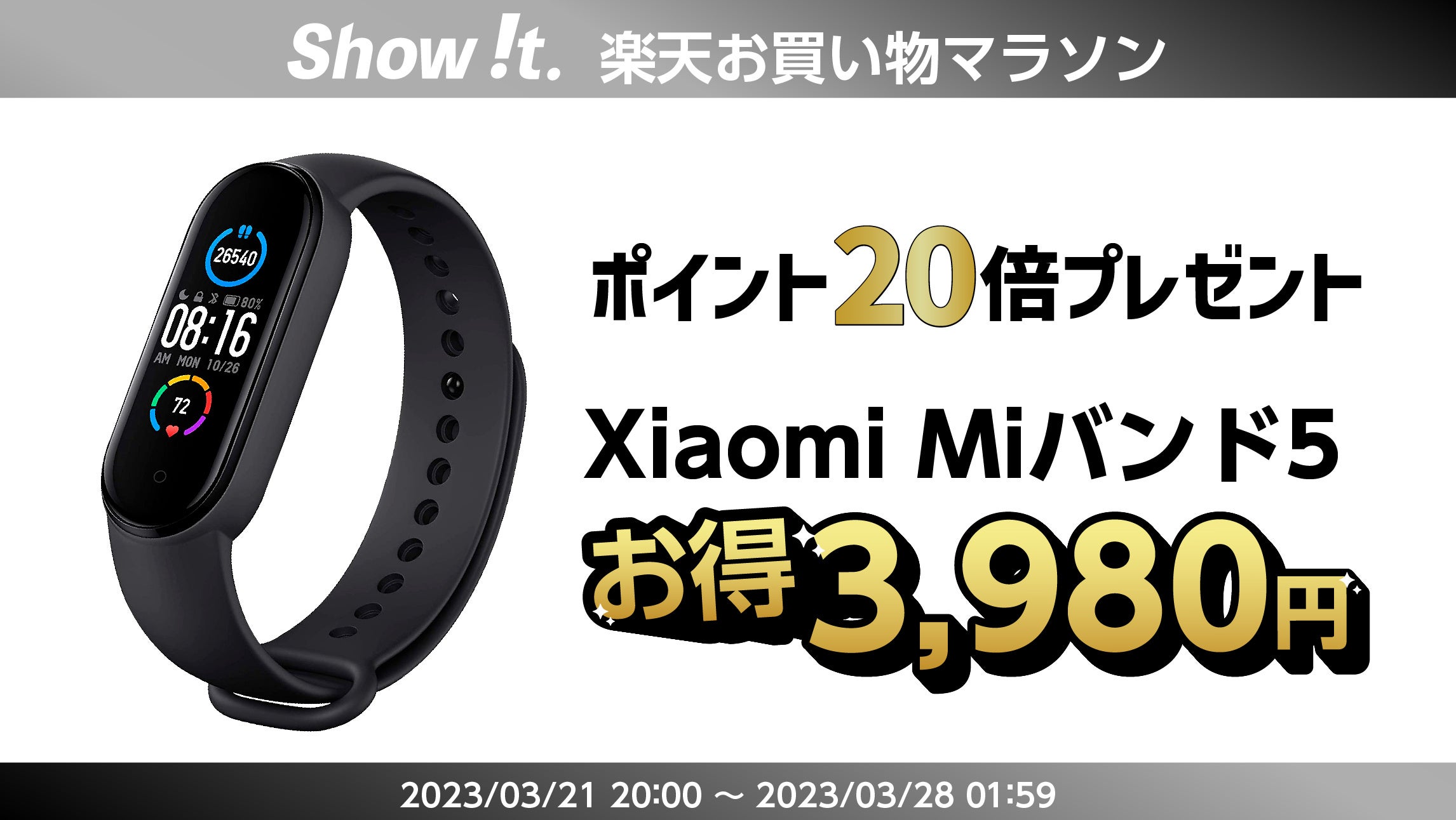 楽天「Show !t」でポイント20倍がもらえるシャオミMiバンド5をセール価格で販売決定、さらに3月21日20時開始、楽天お買い物マラソンでショップ内全商品ポイント10倍プレゼントを実施。