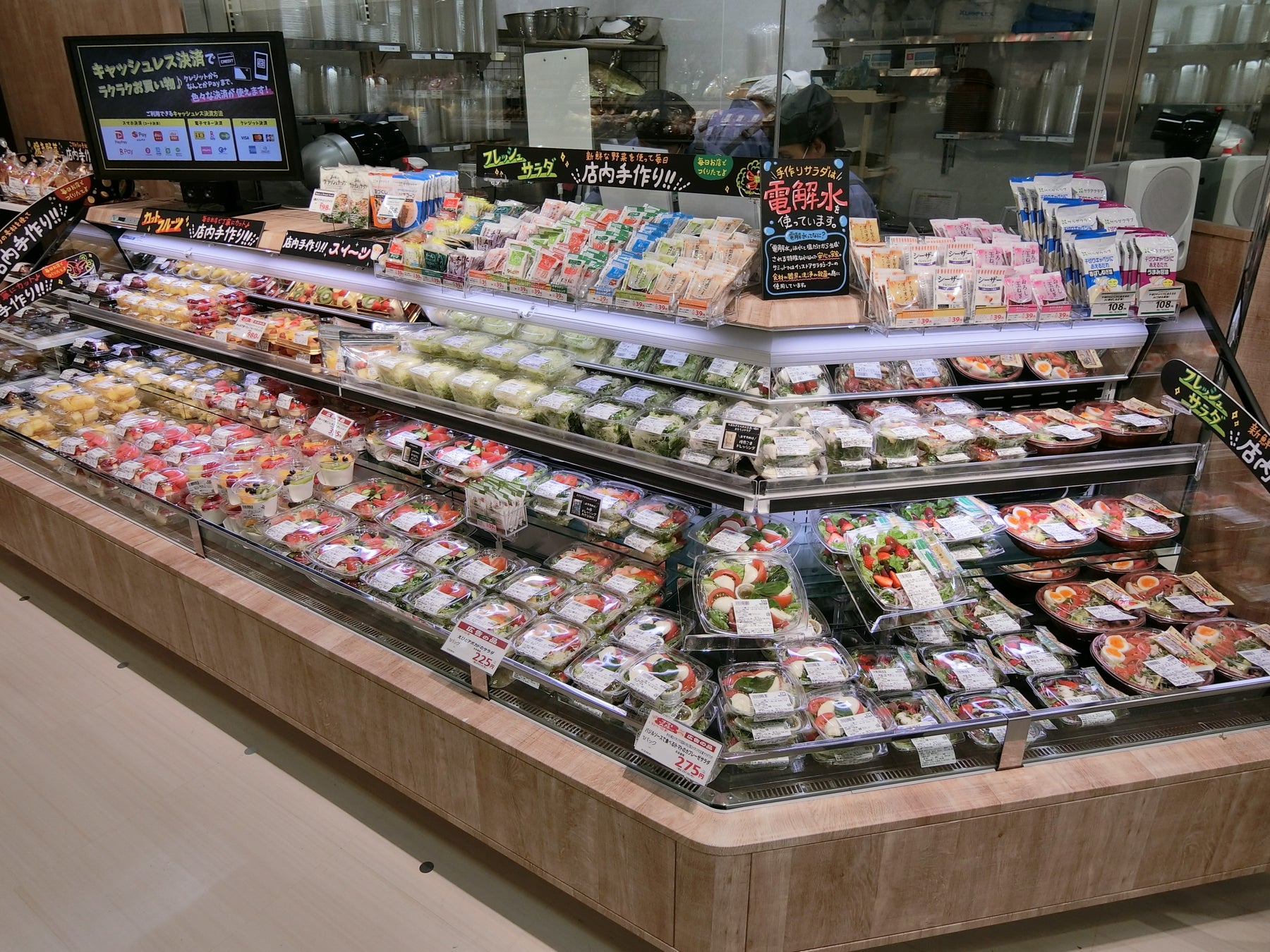 エスカレーターを降りてすぐの青果売場入口に「フレッシュサラダ&カットフルーツ」コーナーを新設しました。売場で販売している新鮮な素材を使ったサラダや、カットしたてのジューシーなフルーツ、それらのフルーツを使ったデザートなどを販売します。鮮魚売場には「おさかなキッチン」コーナーを導入。鮮度のよい丸物の魚を提供し、加工調理も承ります。精肉売場では焼肉の品揃えを充実させ、冷凍食品売場では新たな冷凍ケースの導入に伴いアイテム数を拡大しました。加工食品や日配品もこちらのフロアです。売場奥には、おすすめやリクエスト商品を試食できる「おためし下さい」コーナーも新設しました。