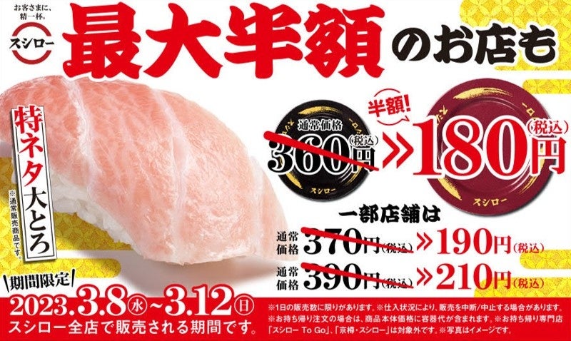 株式会社あきんどスシロー(本社:大阪府吹田市、代表取締役社長:新居 耕平)は3月8日(水)から12日(日)の5日間限定で、スシローこだわりの「特ネタ大とろ」を通常黒皿の360円(税込)※2で販売しているところ、赤皿の180円(税込)※3にてご提供いたします。