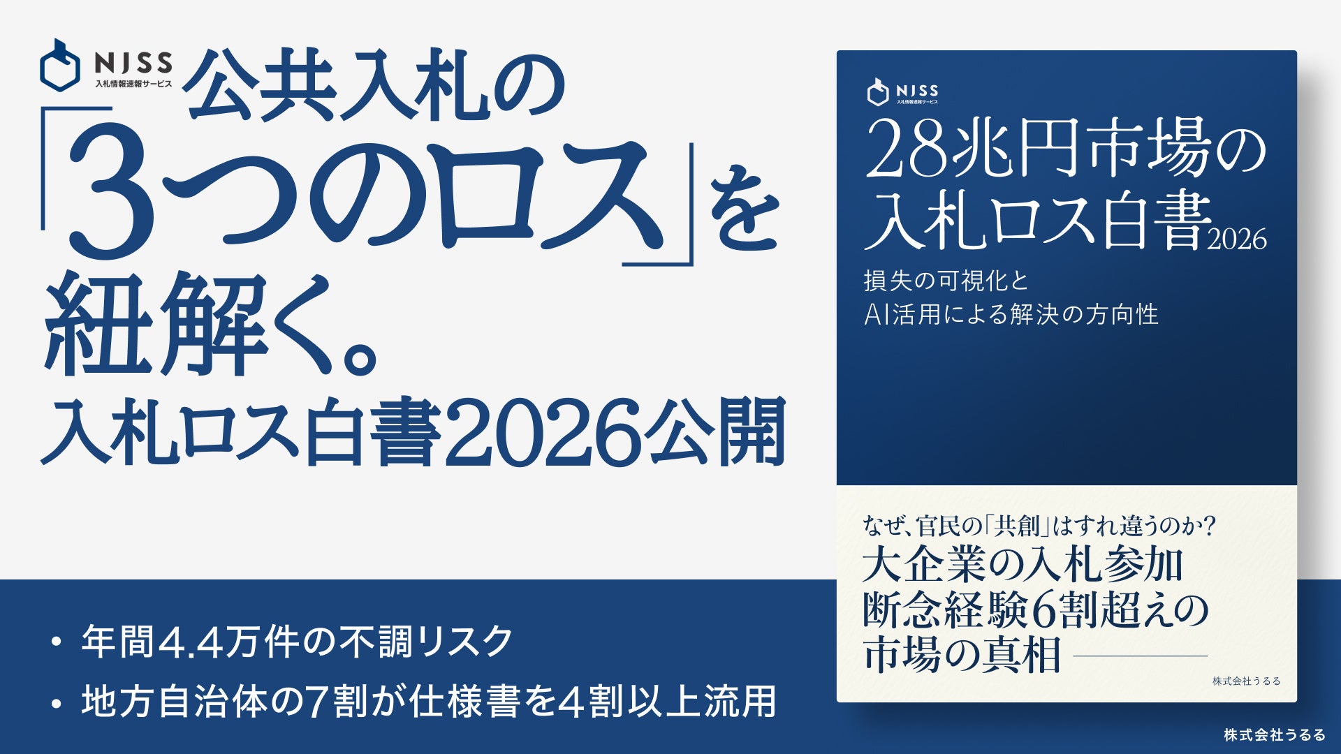 労働力不足問題解決のリーディングカンパニーとして複数のSaaSを展開する株式会社うるる(東京都中央区、代表取締役社長CEO:星 知也、以下「うるる」)が運営する入札情報速報サービス「NJSS(エヌジェス)」は、公共入札市場の構造的なロスを可視化し、今後の市場の進化についての提言をまとめた「入札ロス白書2026」を本日公開いたしました。