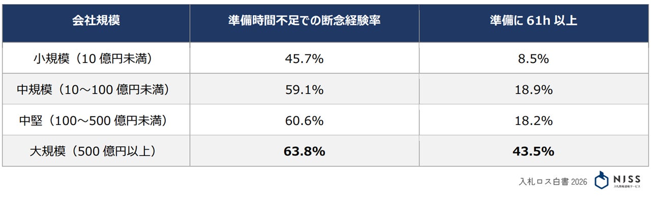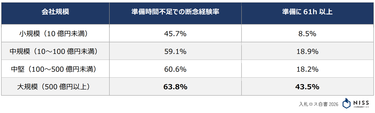 大企業の断念経験:売上500億円以上の大規模企業の63.8%が準備時間の不足により入札参加の断念経験があると回答。企業規模が大きくなるほどその数値は高くなる。