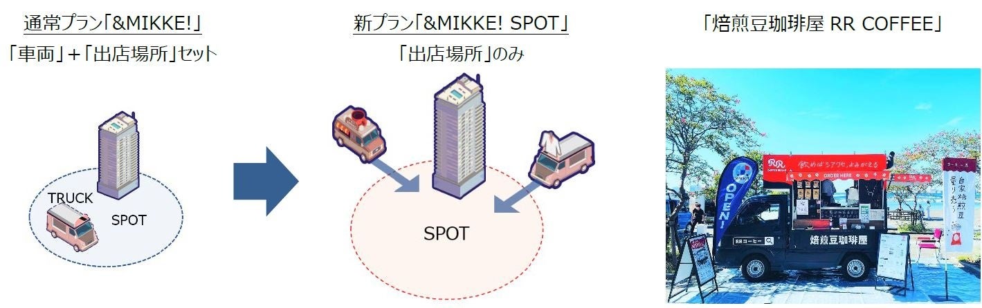 従来は「車両」と「出店場所」をセットで貸し出ししておりましたが、事業開始1年を経て、車両内での調理行為を伴うキッチンカーなどの飲食業態や本事業での出店時の売上が好調で自ら移動販売車を製作・購入を検討される店舗様からは、場所だけ借りたいという声をいただくようになりました。このような背景のもと、お客様の多種多様なニーズに応えていくために「出店場所」のみ貸し出す「&MIKKE! SPOT」の導入を正式に開始しました。2022年11月7日より募集スタートとなりますので、詳しくは下記ページをご覧ください。なお、車両のみ貸し出すプランについても検討しております。