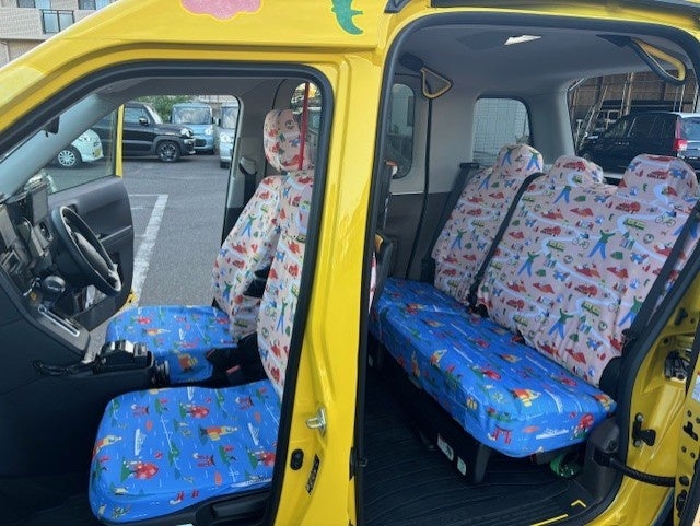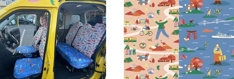 車内のシートカバーも瀬戸内の街の賑わいと楽しさあふれる海の様子を表現しています。