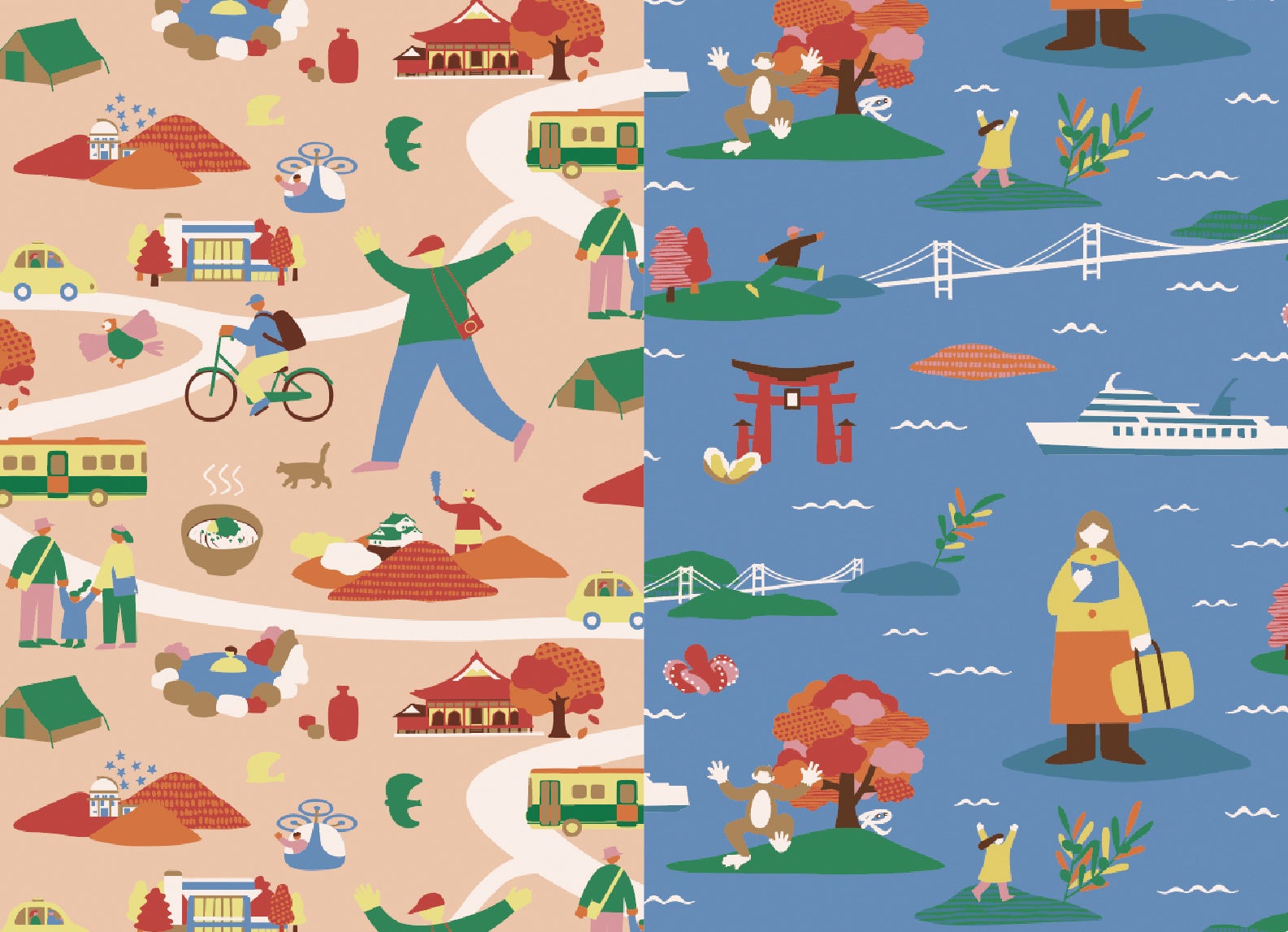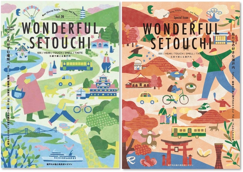 また、前回の20号と今回の特別号の表紙を繋げると、瀬戸内の魅力的なスポット、特産品、桃太郎ご一行などが描かれた一枚のイラストとなっており、春から秋にかけての瀬戸内の季節の移り変わりや、20号で空車だったタクシーに特別号ではお客様が乗車していたり、20号で別々に旅をしていた男女が特別号で家族になっていたりと、様々な楽しいしかけが盛り込まれています。